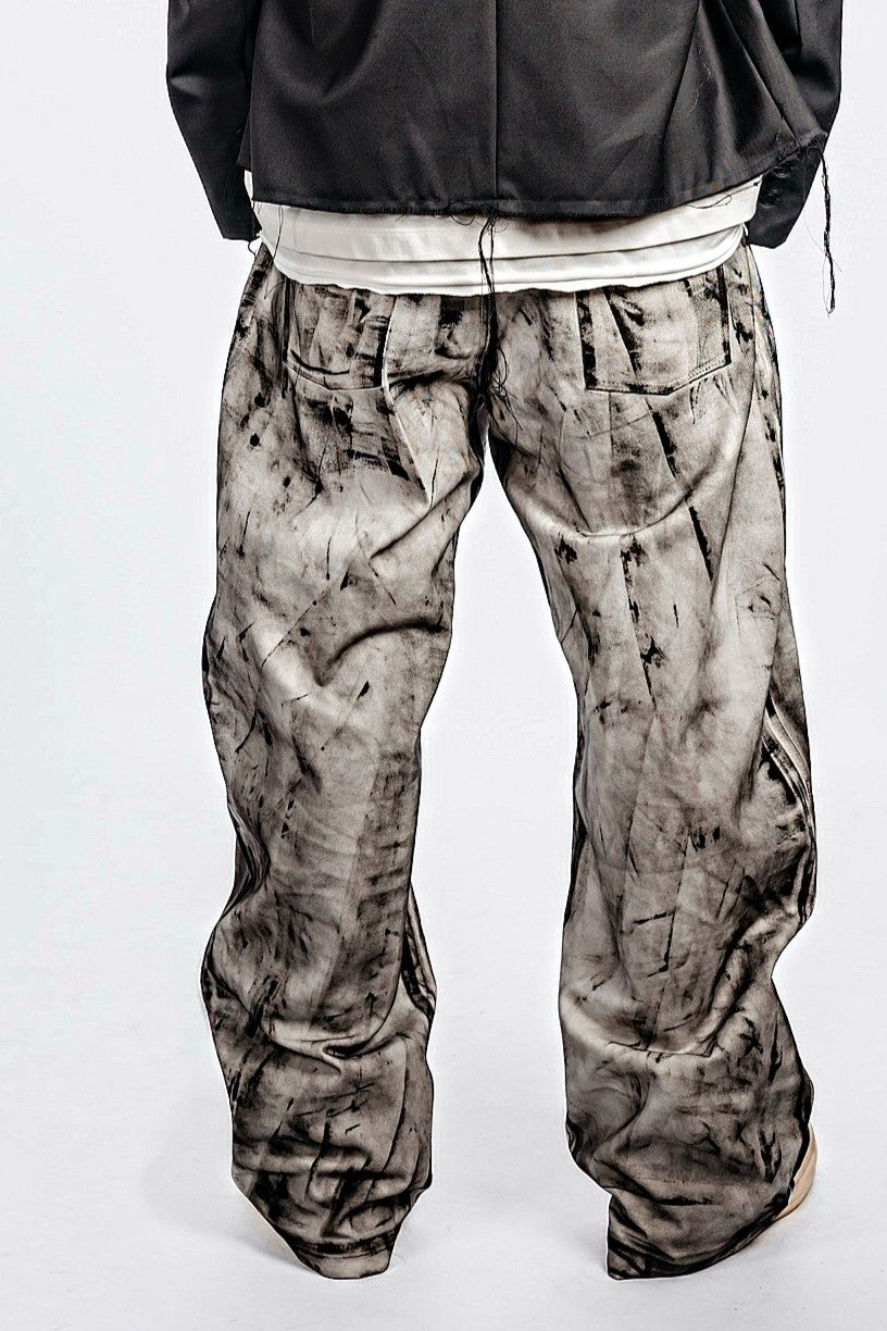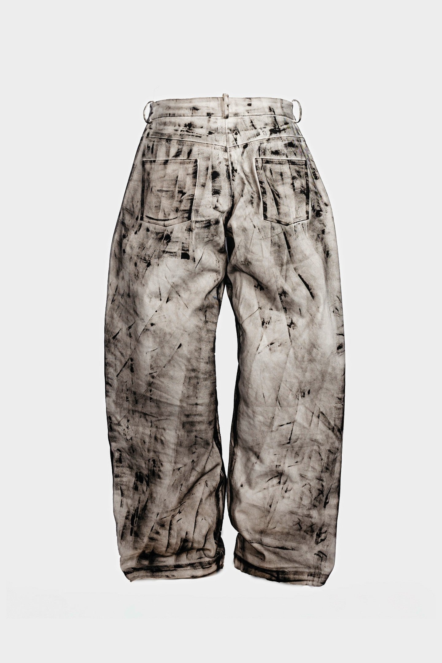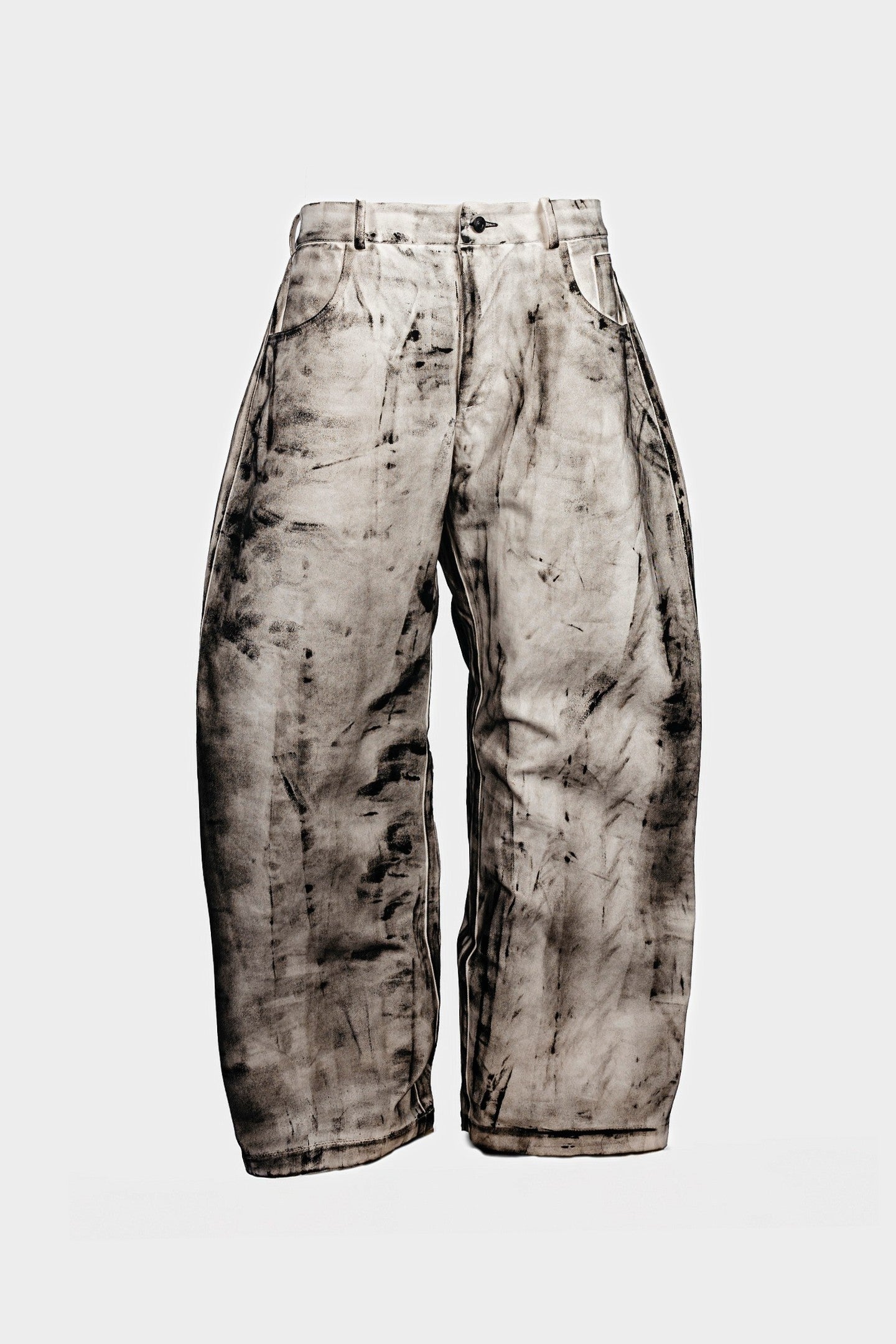 Mid-rise oversized hand-tinted oval pants with front and back patch pockets, zip fly and button closure, designed for a relaxed fit.