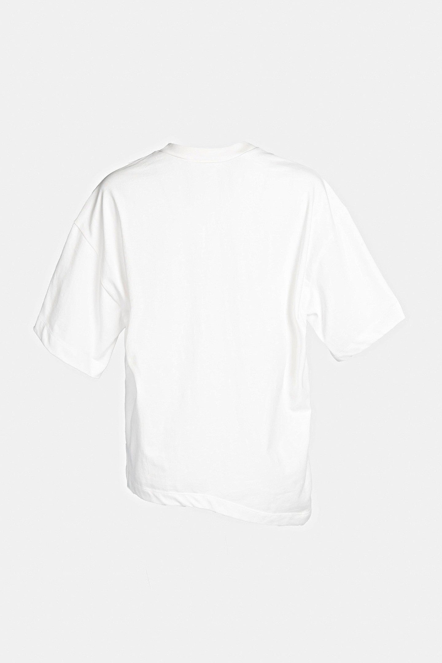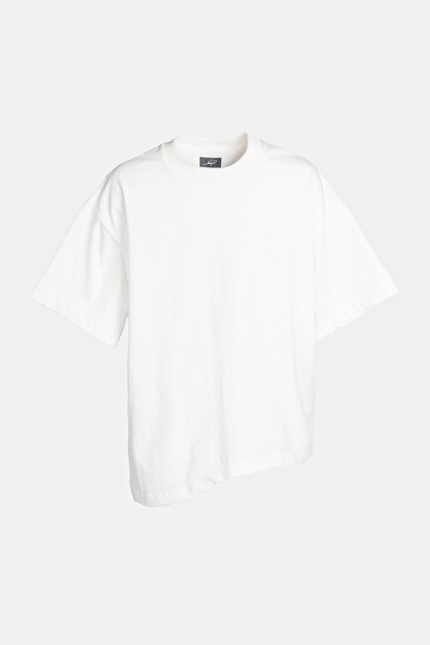 Cropped t-shirt with an unexpected wave. Cut with a loose, boxy fit that sits around the waist, the hem dips asymmetrically to one side, creating a sculptural drape that moves with the body. Clean neckline, minimal finish, and no embellishments—just pure, directional form.