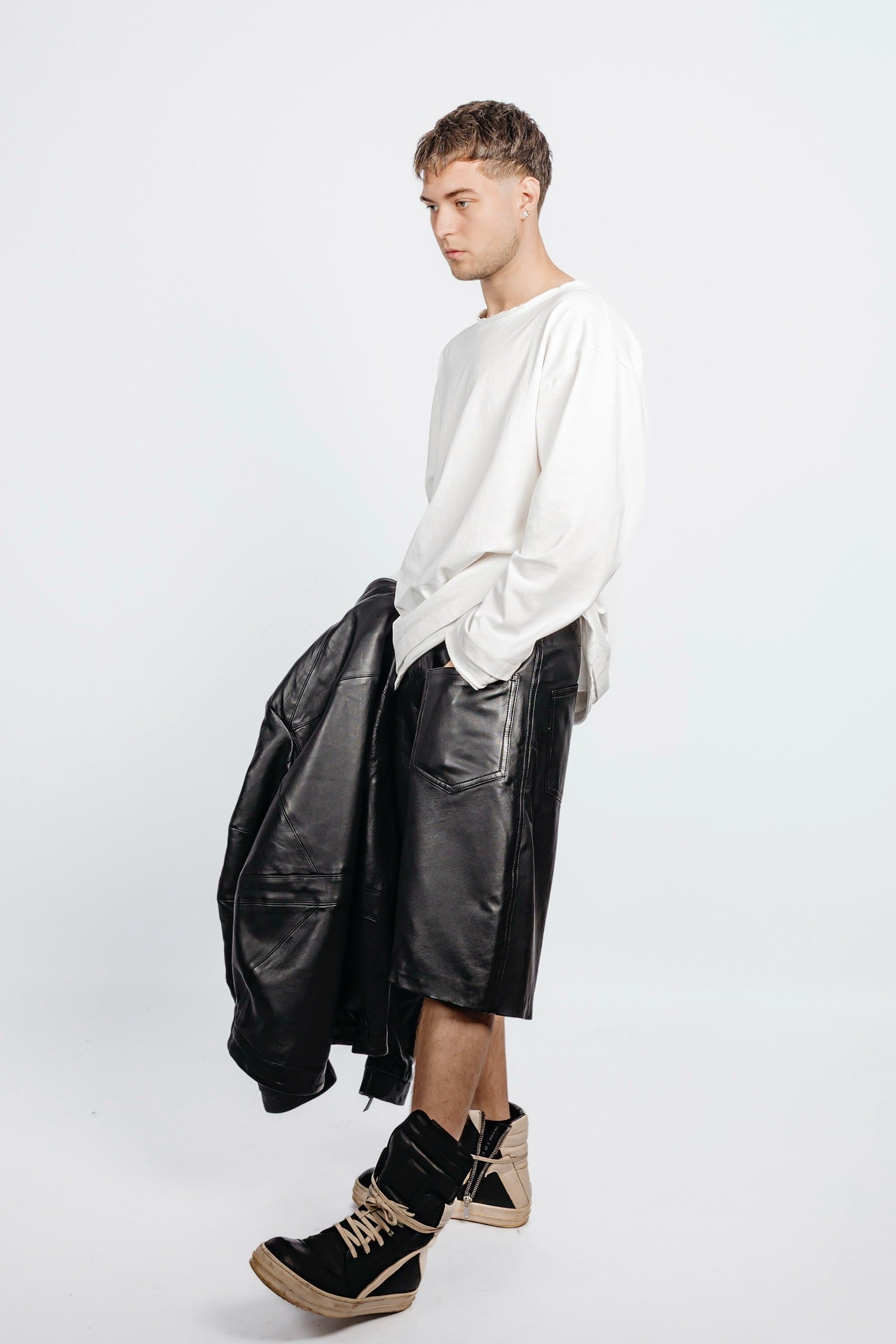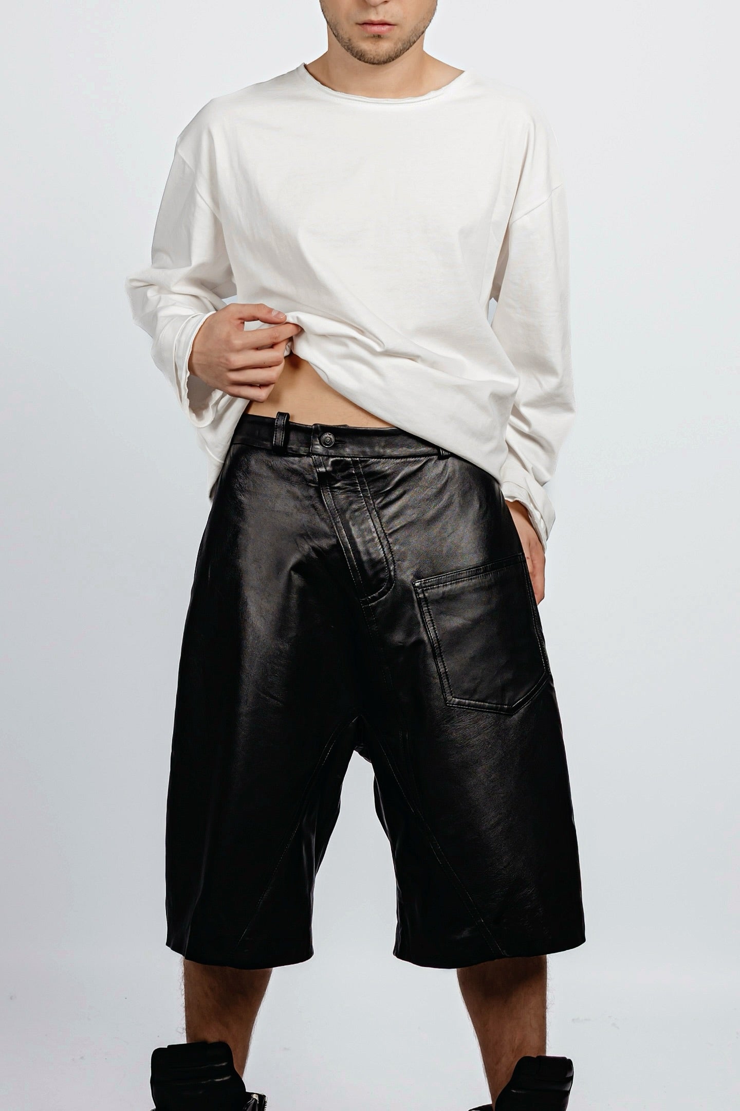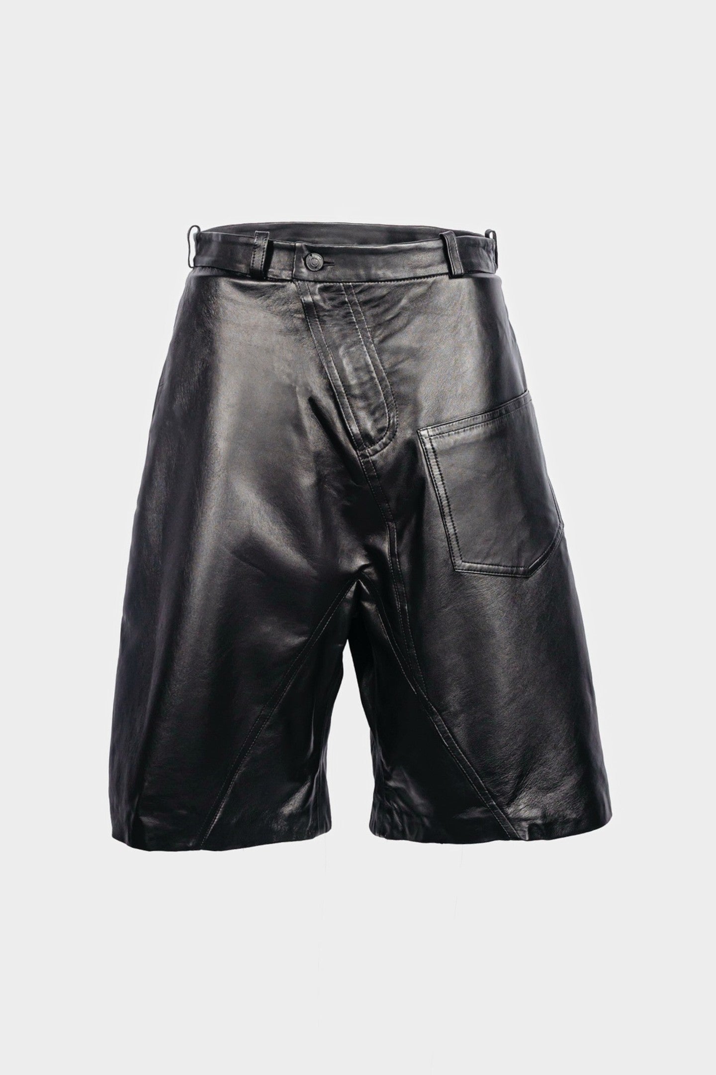 Cropped calfskin pants with a bold diagonal seam and matching front patch pocket. Oversized back pockets define the form. A-shaped hem seams. Fully lined.