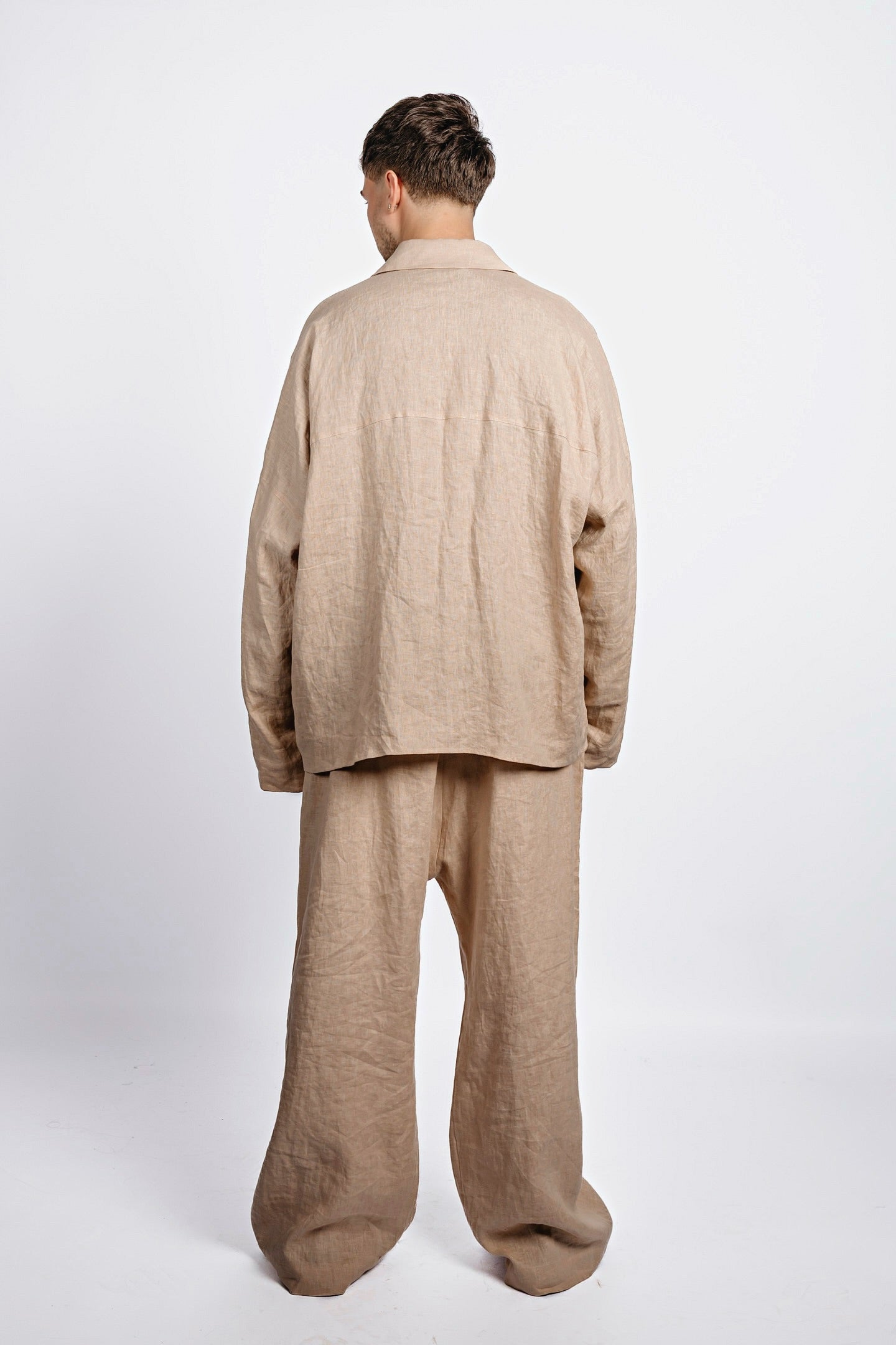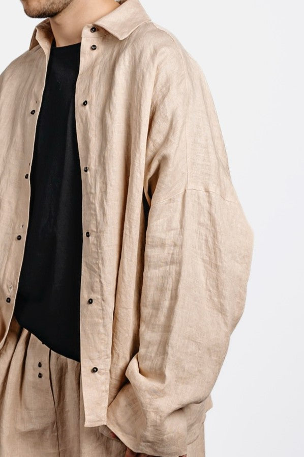 Relaxed linen shirt with a softened, structured silhouette. Finished with a fixed cuff detail, subtly refined by twin buttons—allowing for a looser or closer wrap.
