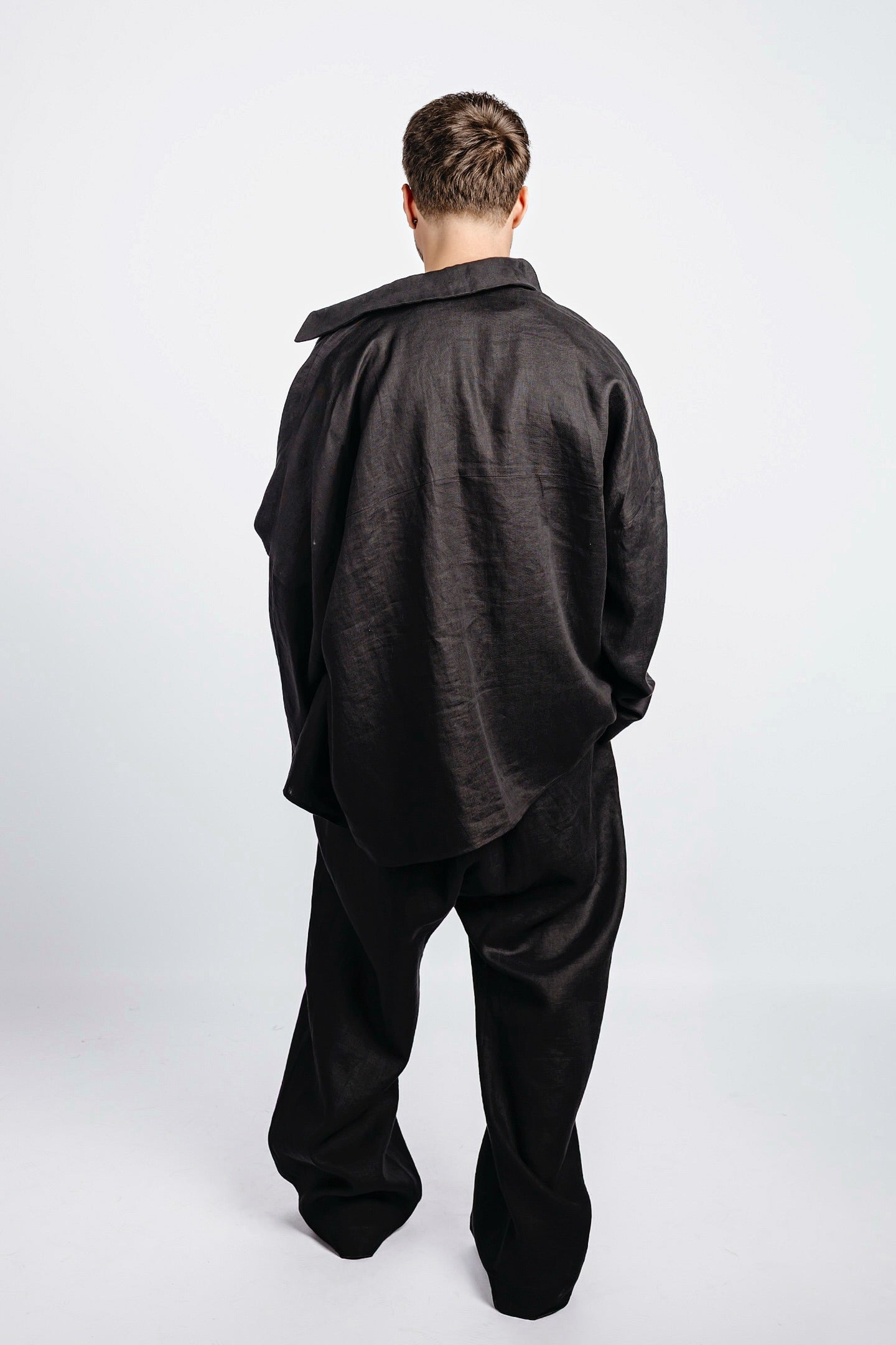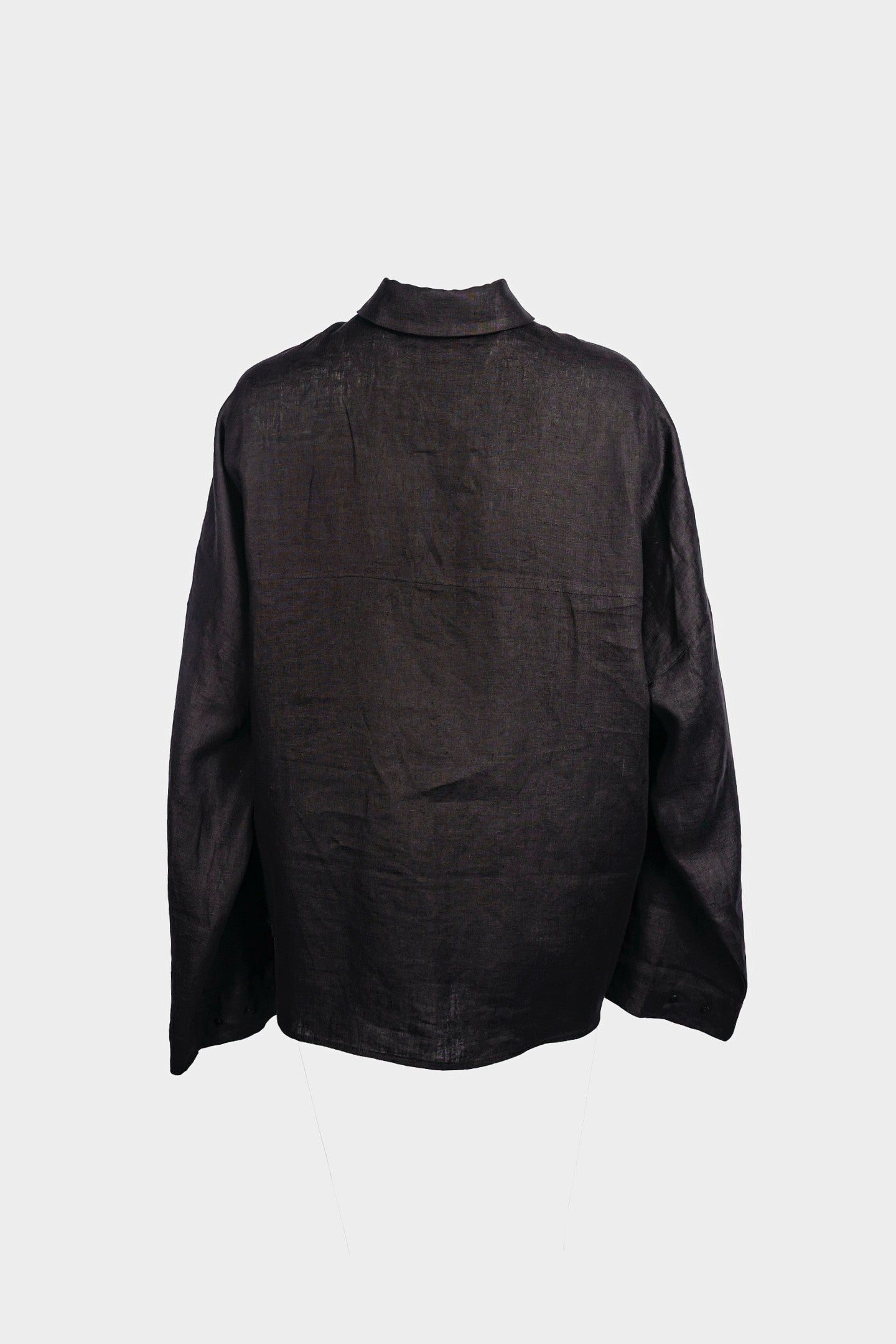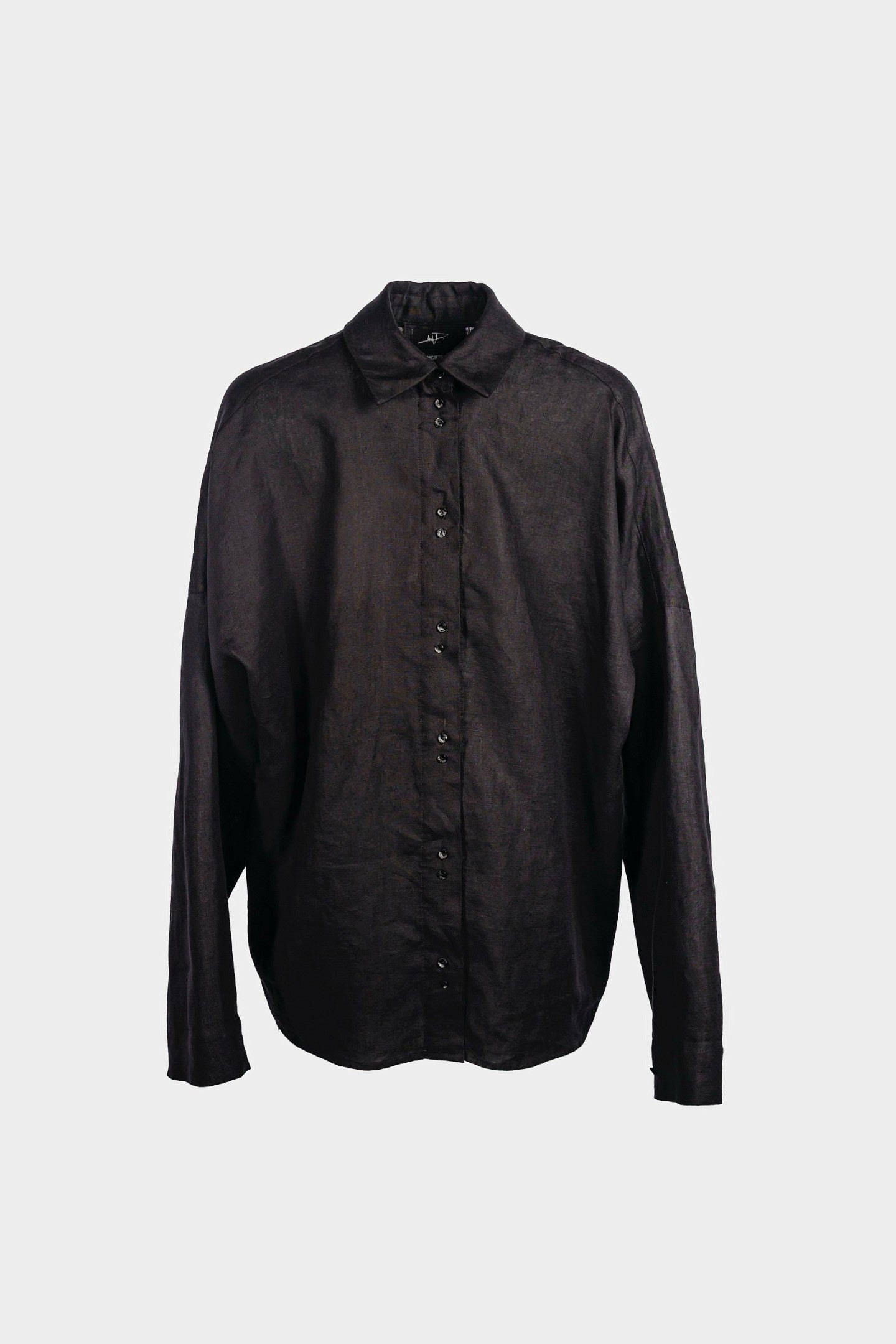Relaxed linen shirt with a softened, structured silhouette. Finished with a fixed cuff detail, subtly refined by twin buttons—allowing for a looser or closer wrap.