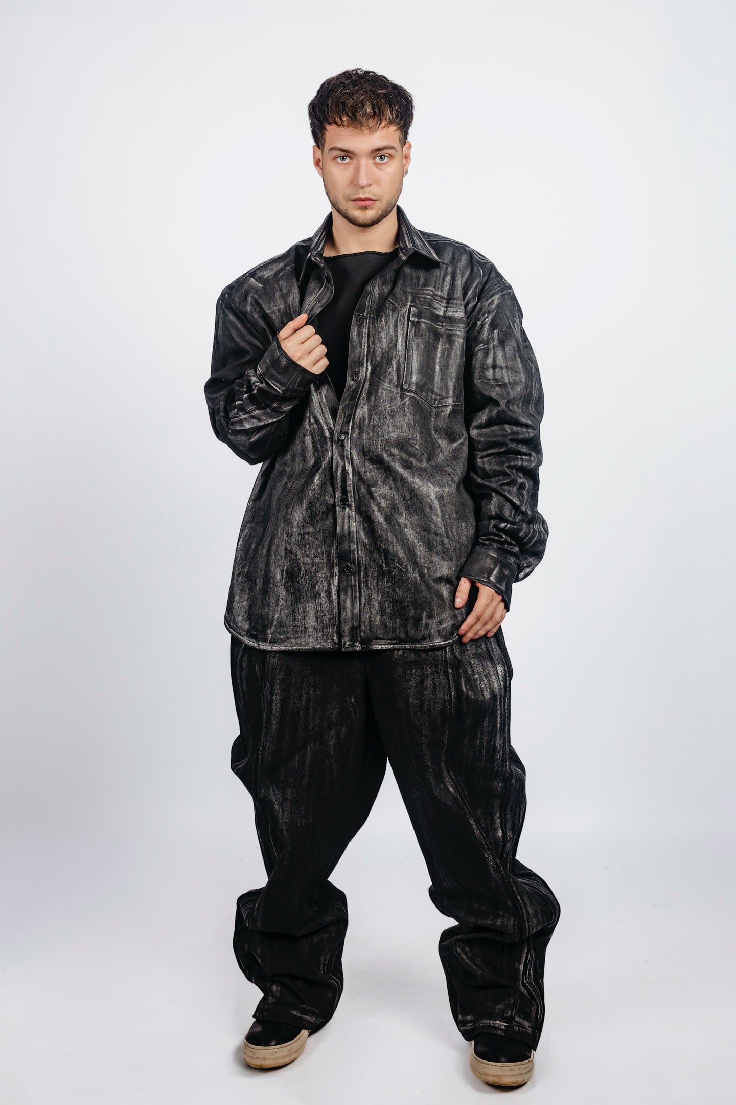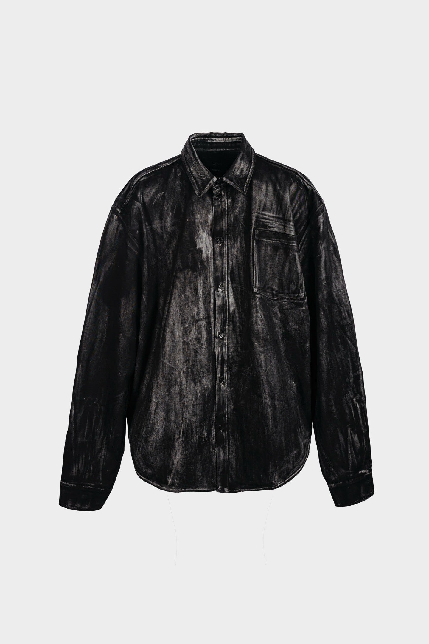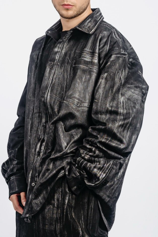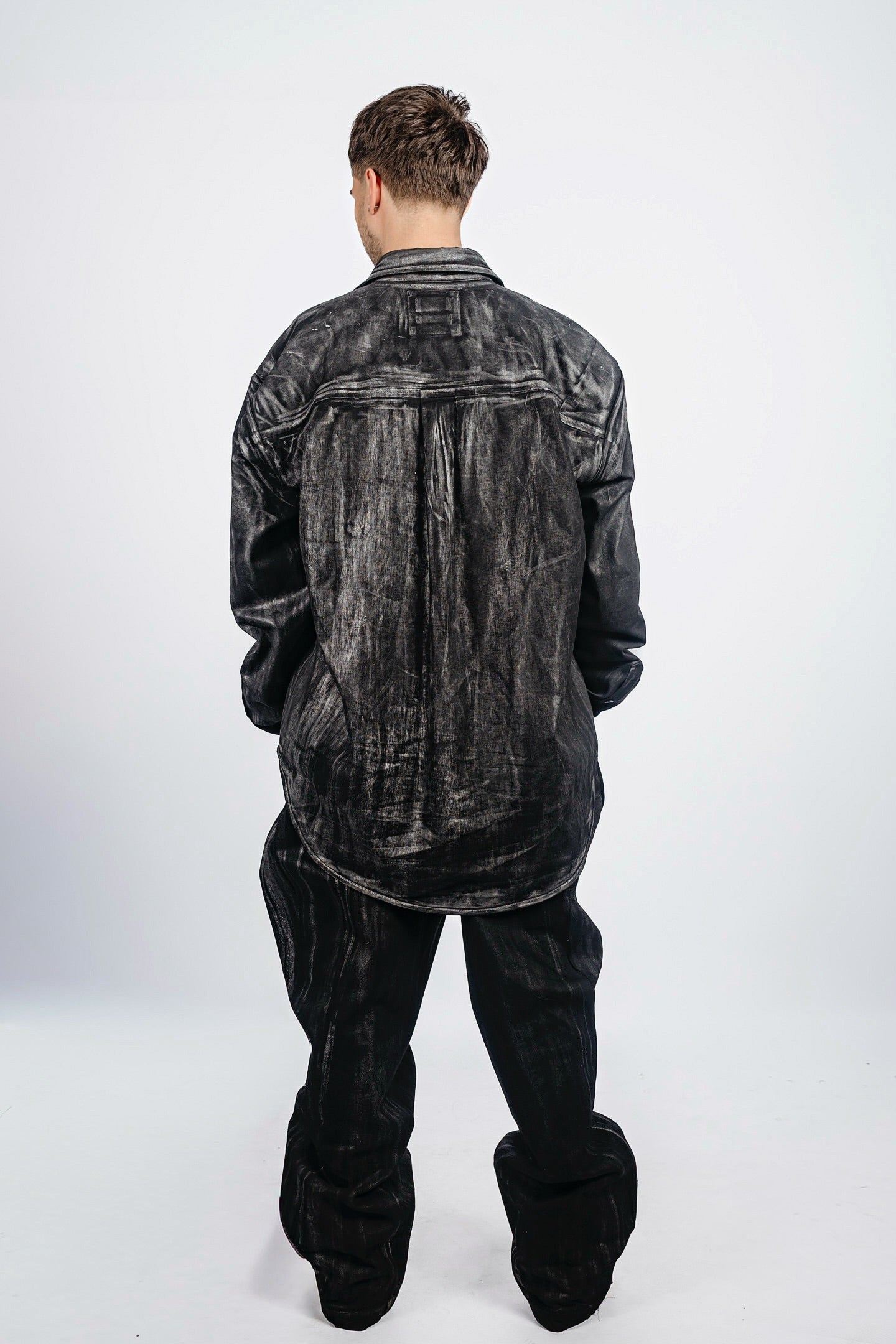 Oversized waxed shirt with a dropped hem and architectural back volume. Features a single chest pocket, extended shirt collar, and central box pleat at the back yoke that creates a hunched, forward-pushing silhouette. Fastens with tonal buttons along the front placket.