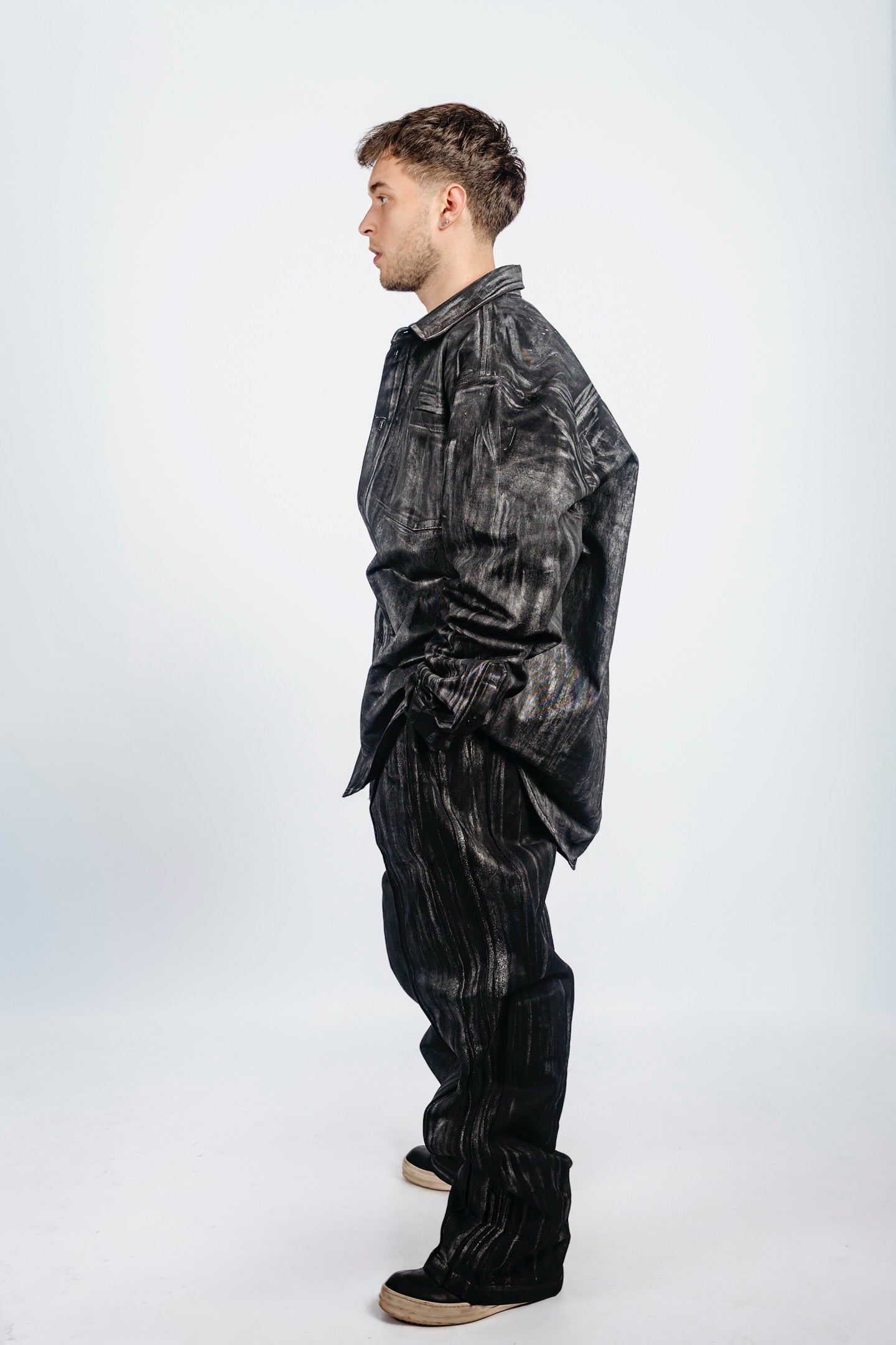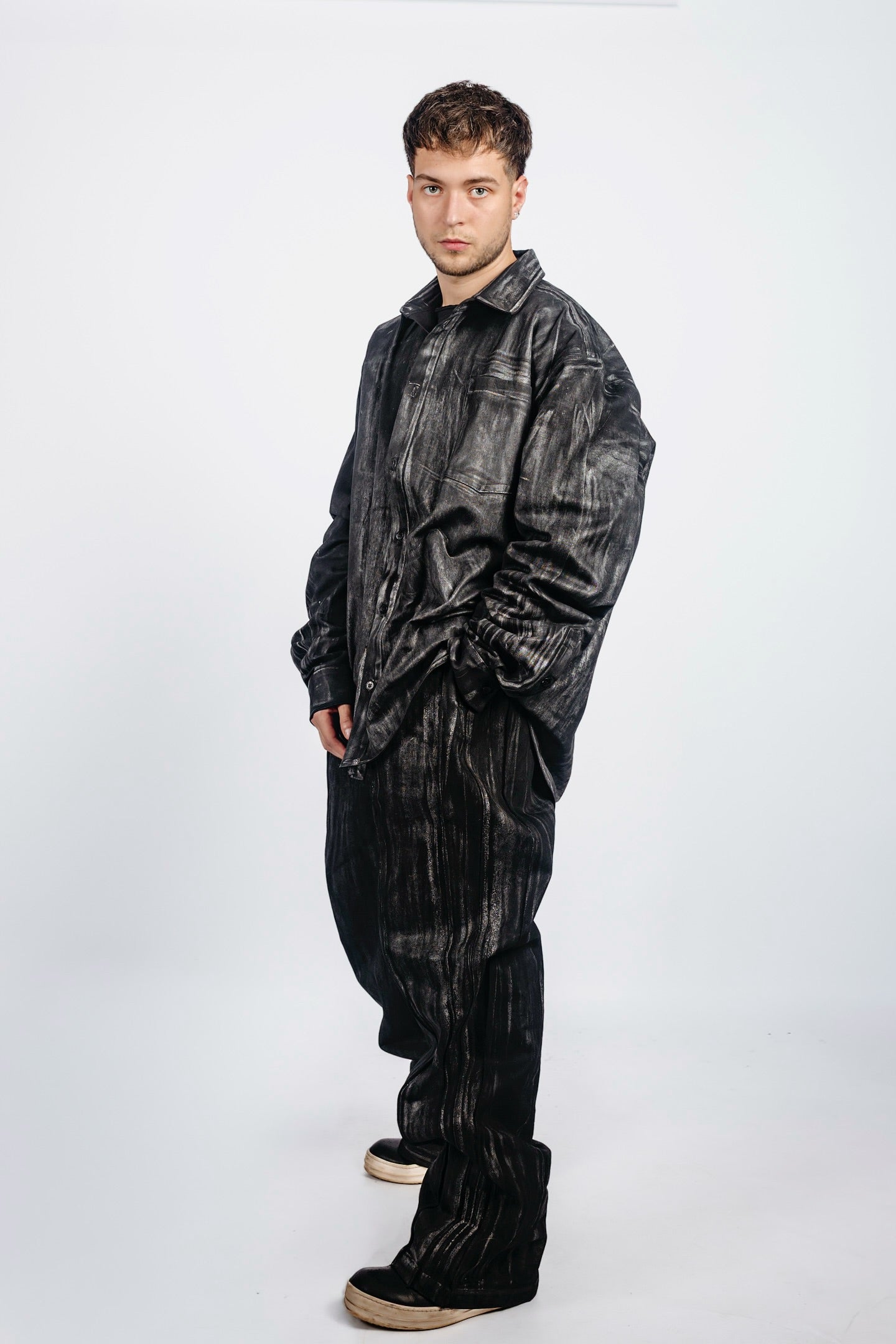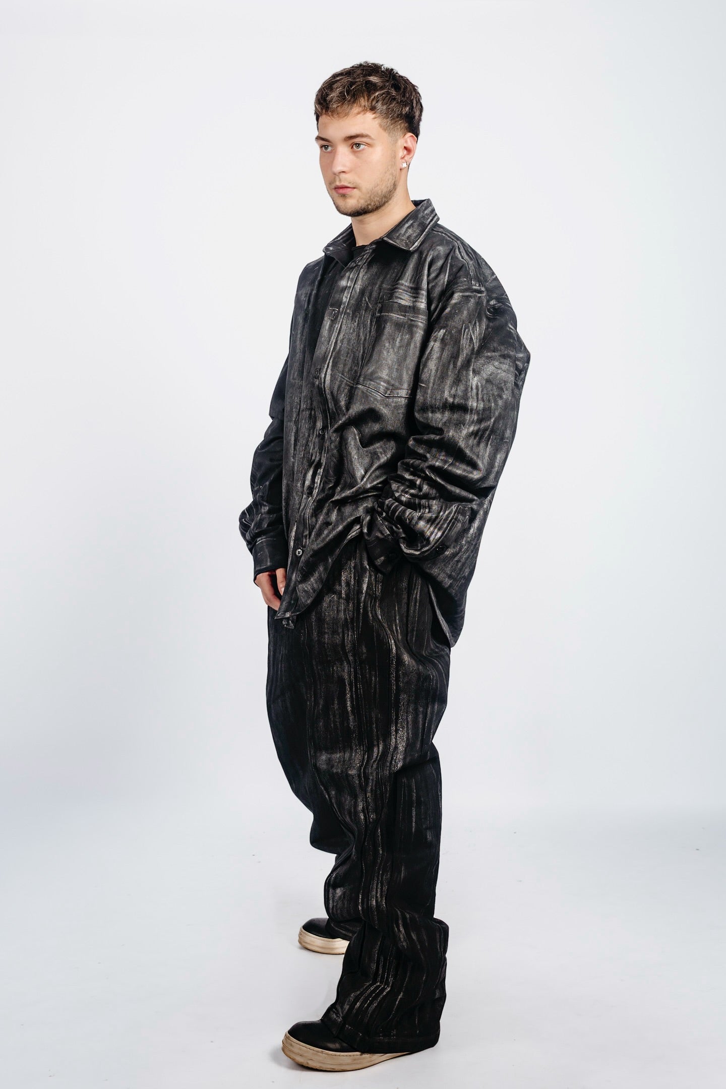 Oversized waxed shirt with a dropped hem and architectural back volume. Features a single chest pocket, extended shirt collar, and central box pleat at the back yoke that creates a hunched, forward-pushing silhouette. Fastens with tonal buttons along the front placket.