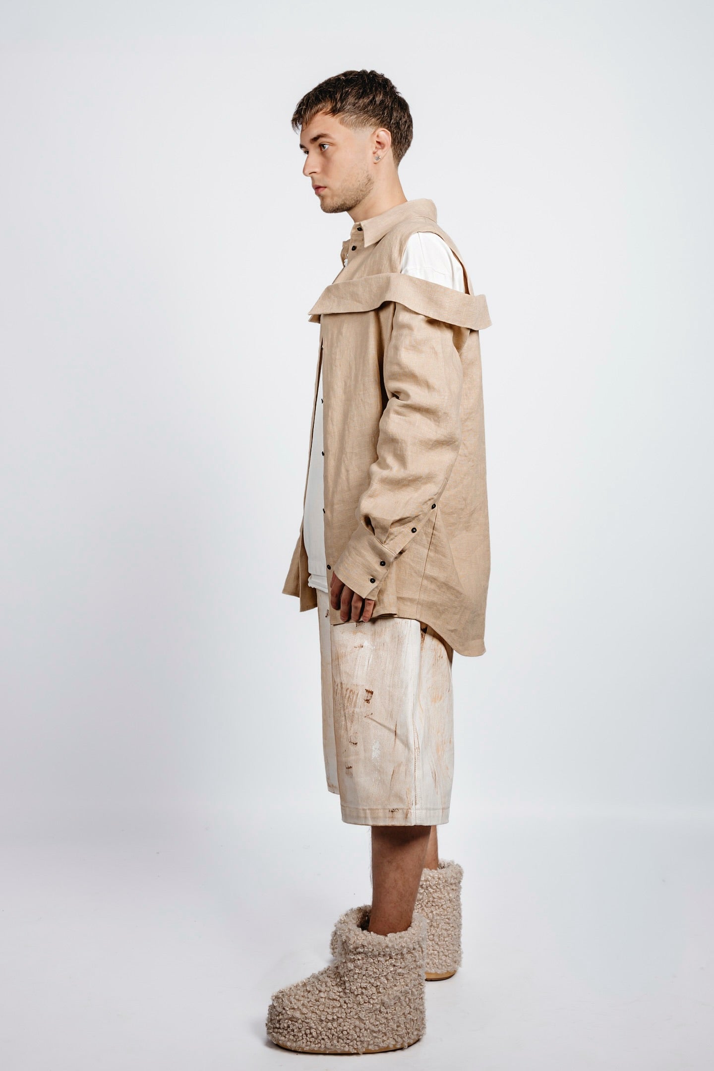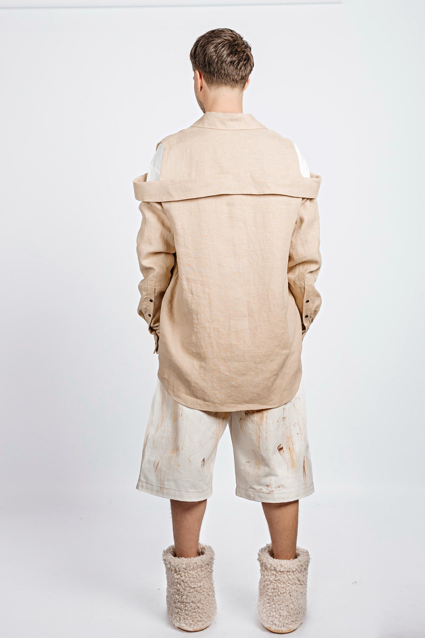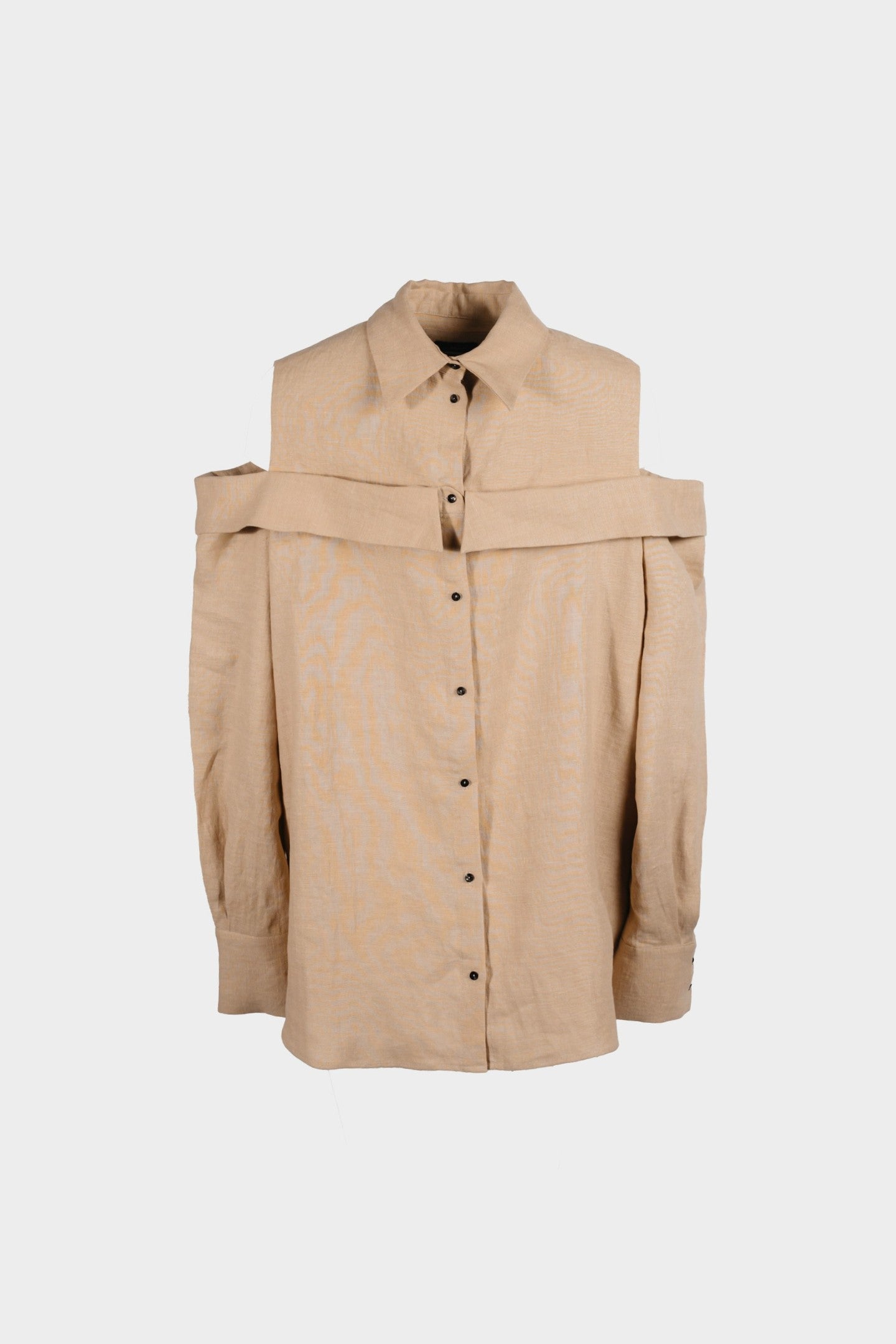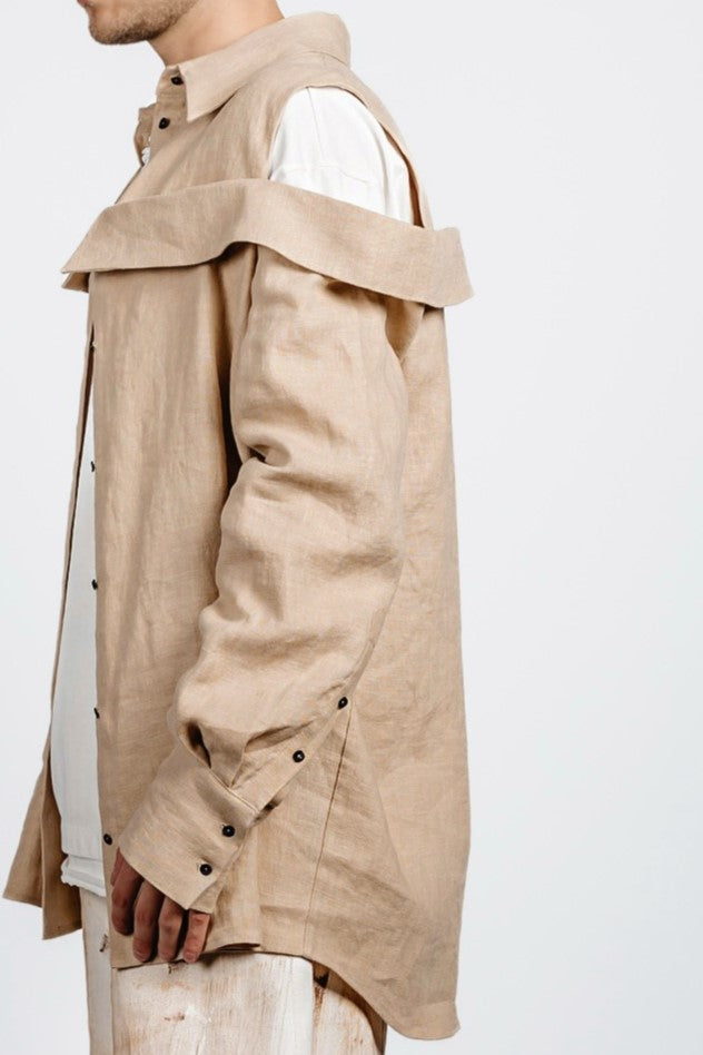 Oversized long shirt cut with a double-collar construction—one at the neck, the other encircling the shoulders. A clean-cut shoulder insert opens the sleeve between the structured shoulder and secondary collar, adding structure to the relaxed silhouette. Functional slits at the cuffs punctuate the elongated sleeves. Precise, unconventional, and unapologetically bold.