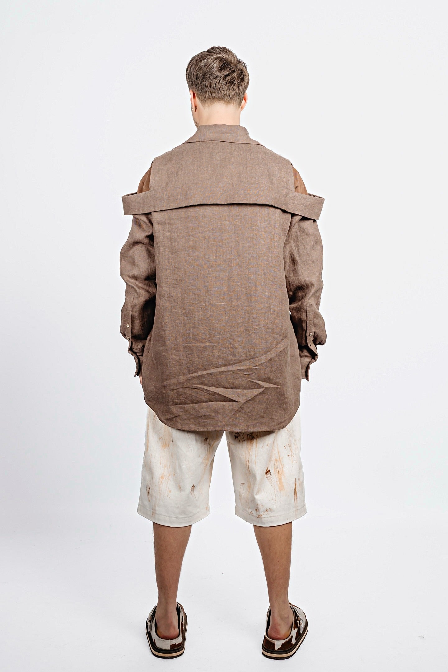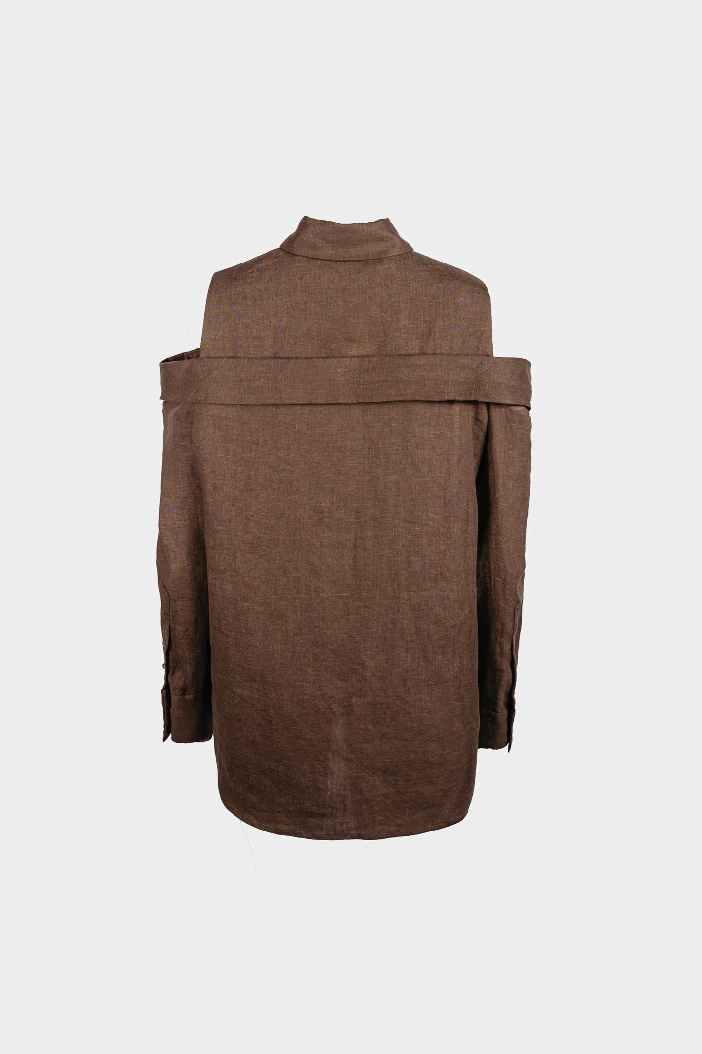 Oversized long shirt cut with a double-collar construction—one at the neck, the other encircling the shoulders. A clean-cut shoulder insert opens the sleeve between the structured shoulder and secondary collar, adding structure to the relaxed silhouette. Functional slits at the cuffs punctuate the elongated sleeves. Precise, unconventional, and unapologetically bold.