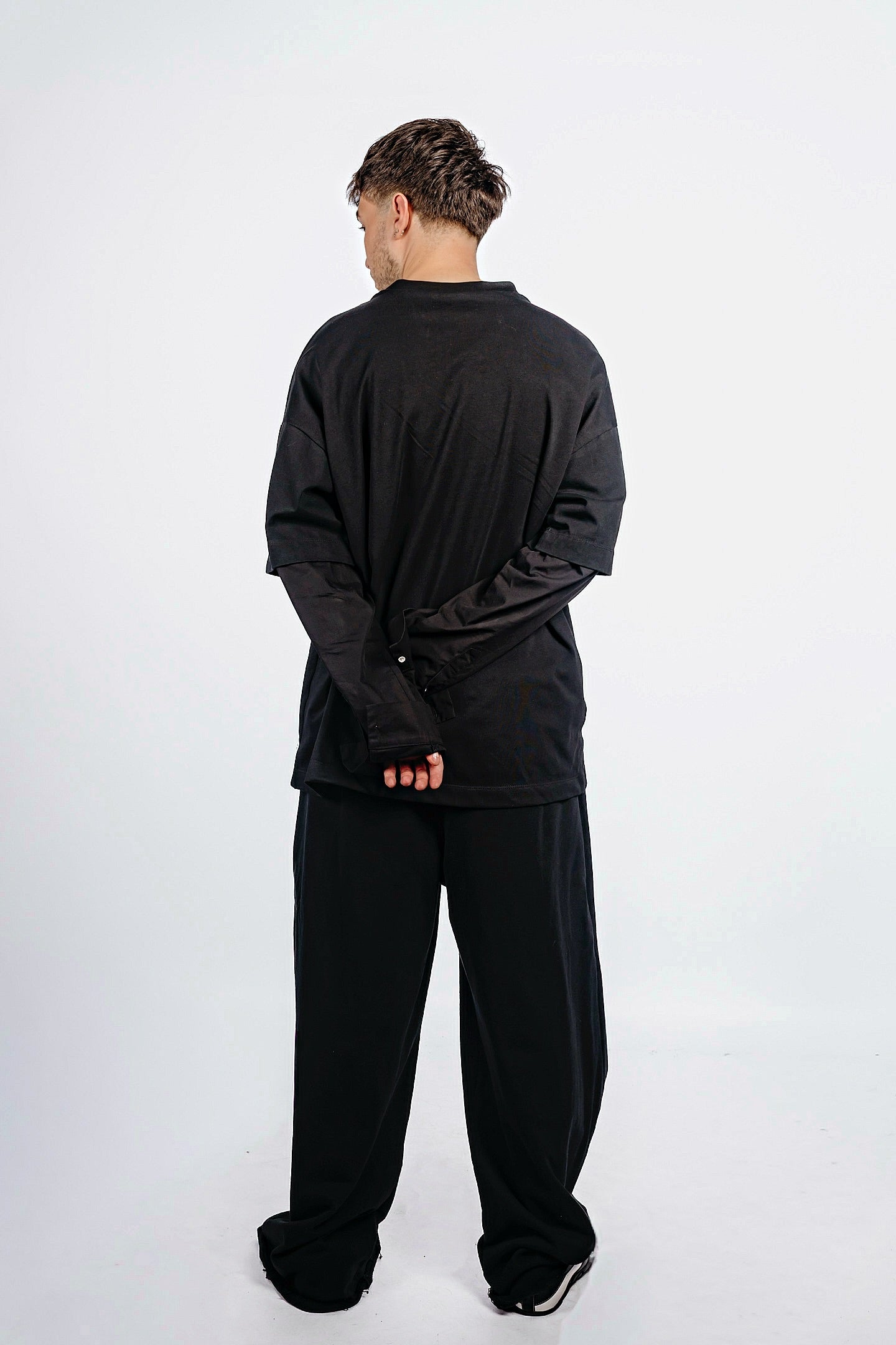 Oversized cotton T-shirt with sharply defined shirt sleeves. Featuring angular pentagon cuts and classic cuffs, it rewrites proportions with clarity and intent.
