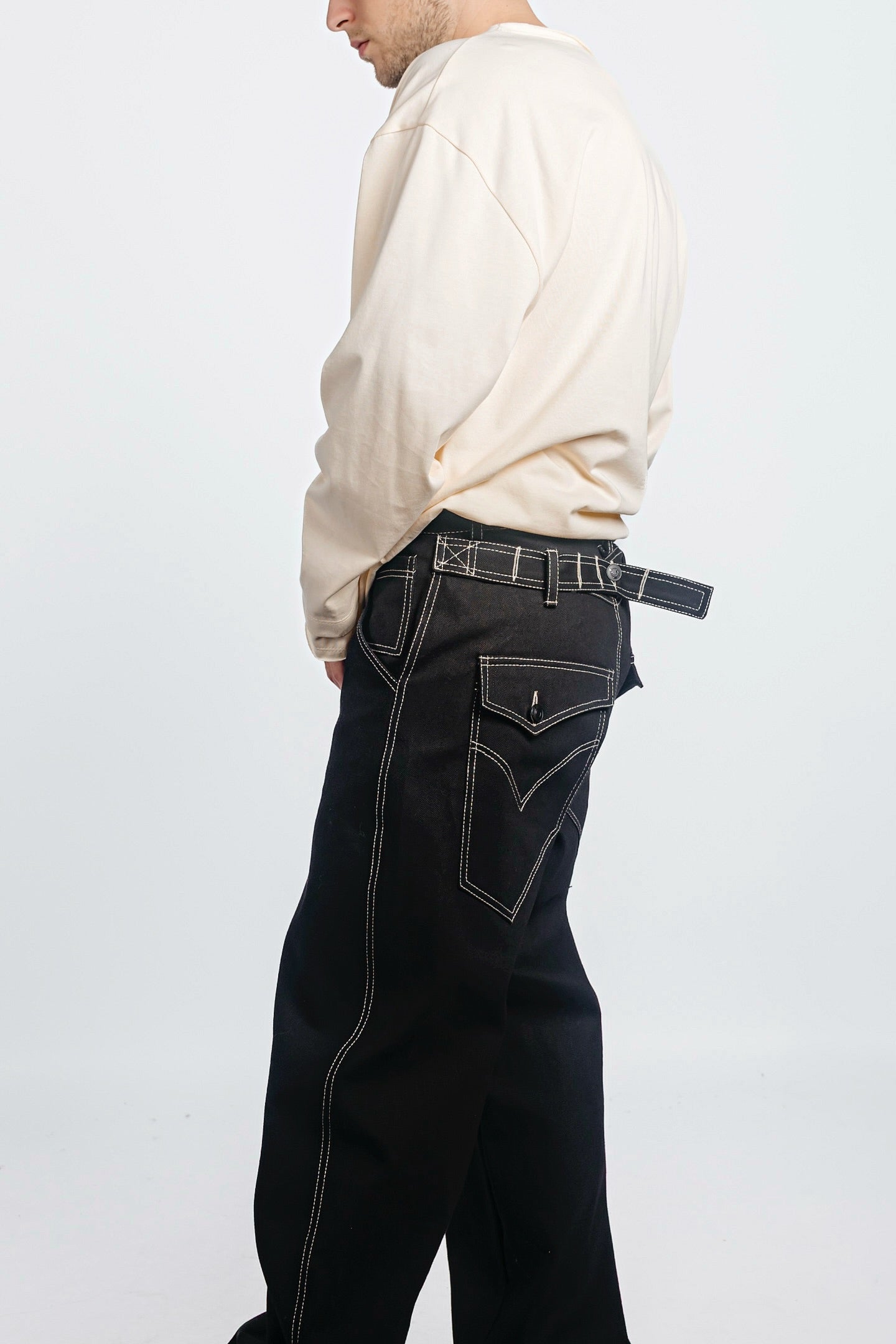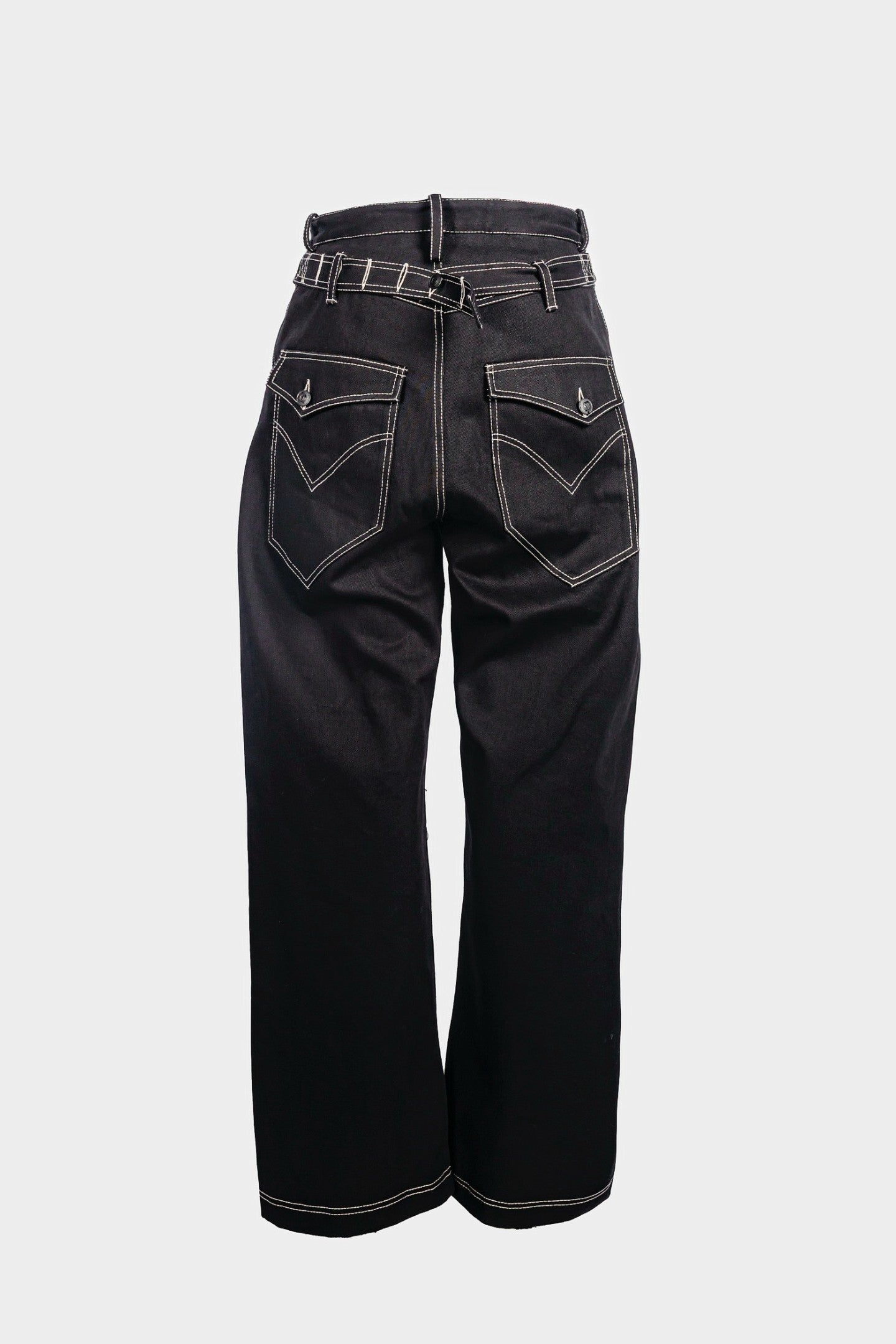 Tailored denim trousers in a heritage-inspired wash, finished with a subtle inward leg line. Rear waistband features two adjustable straps with button closures, evoking a refined utilitarian tradition. Designed with four pockets—two angled in front, two sharp and deep-set at the back, cut in a distinctive V-shape.