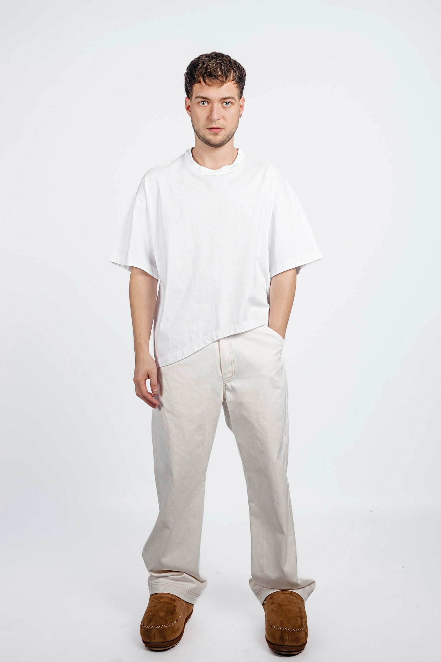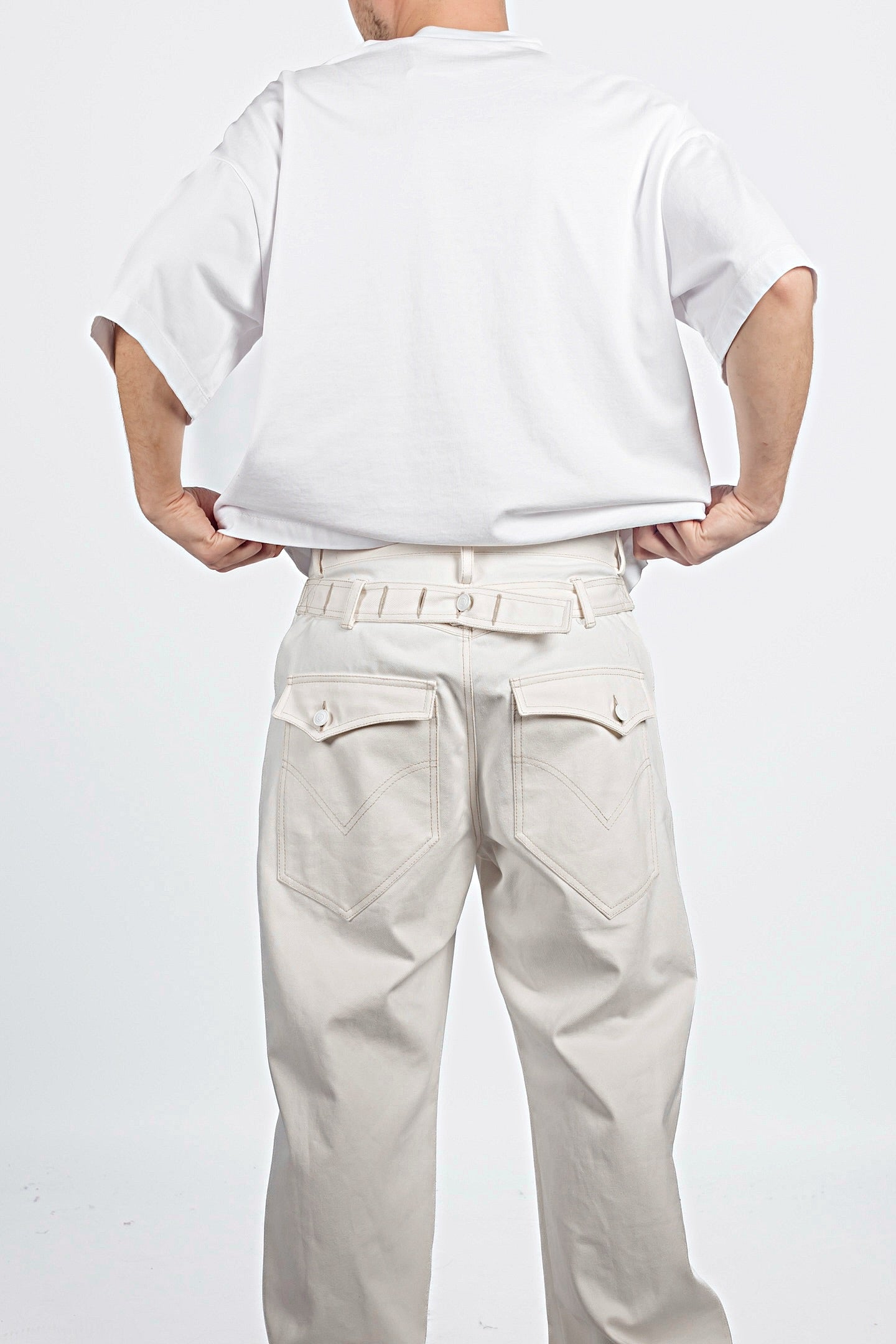 Tailored denim trousers in a heritage-inspired wash, finished with a subtle inward leg line. Rear waistband features two adjustable straps with button closures, evoking a refined utilitarian tradition. Designed with four pockets—two angled in front, two sharp and deep-set at the back, cut in a distinctive V-shape.