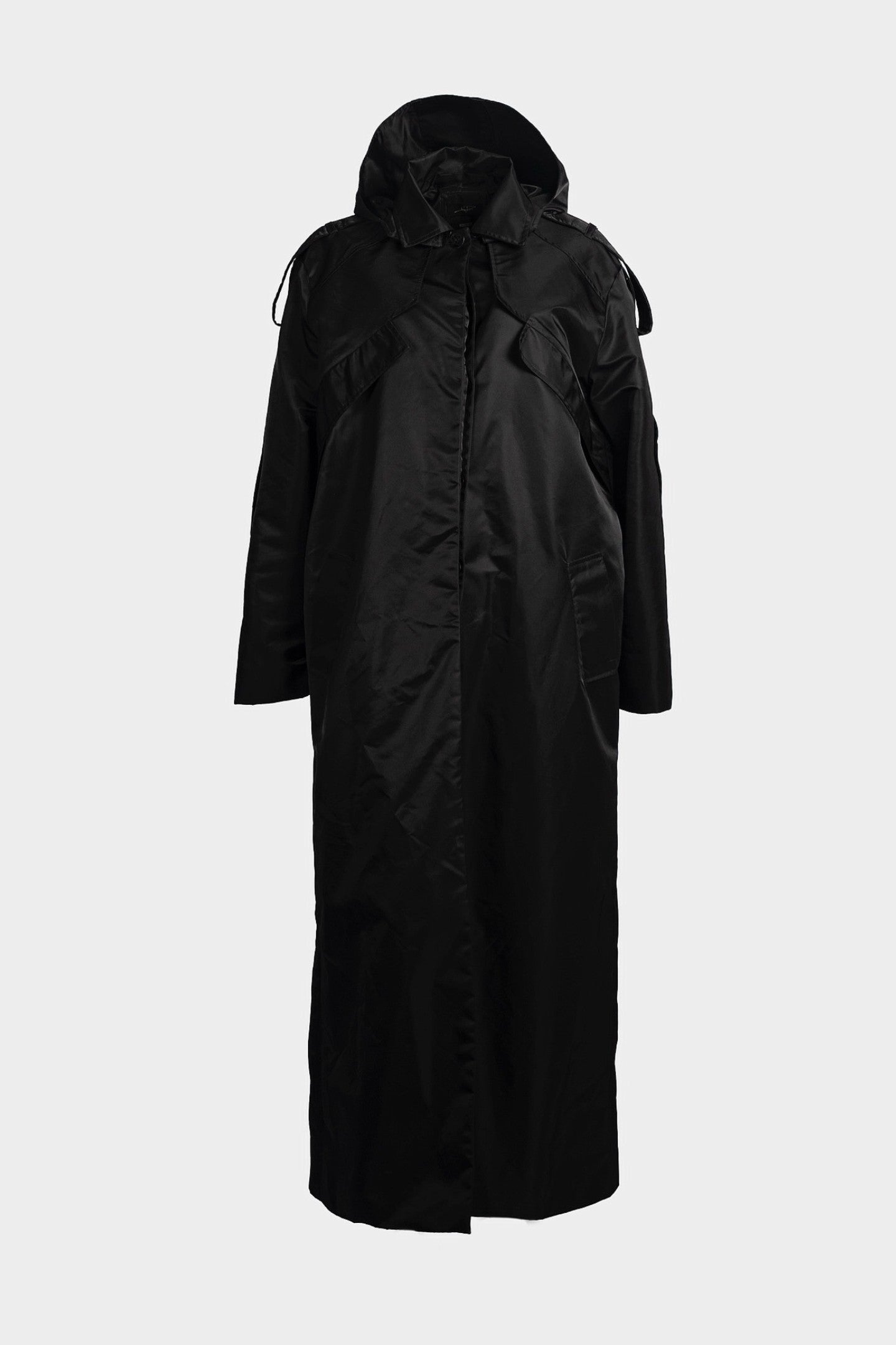 Long trench coat with a deep back slit and extended yoke, crafted in nylon. Features a sharp blazer collar and detachable hood. Two welt pockets front, two interior pockets inside fully lined shell. Adjustable epaulettes fasten on shoulder or sleeve.Functional, elegant, and versatile.