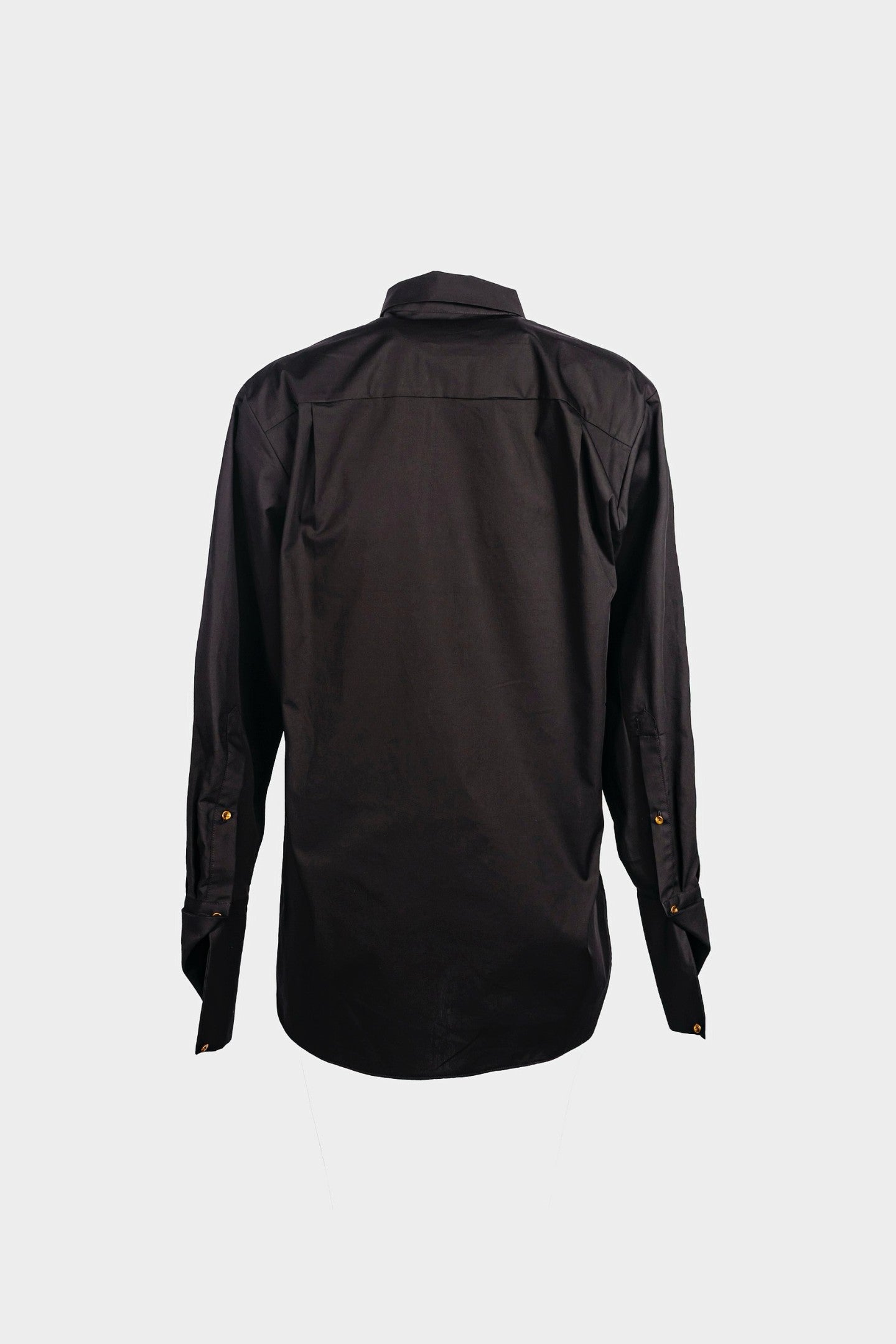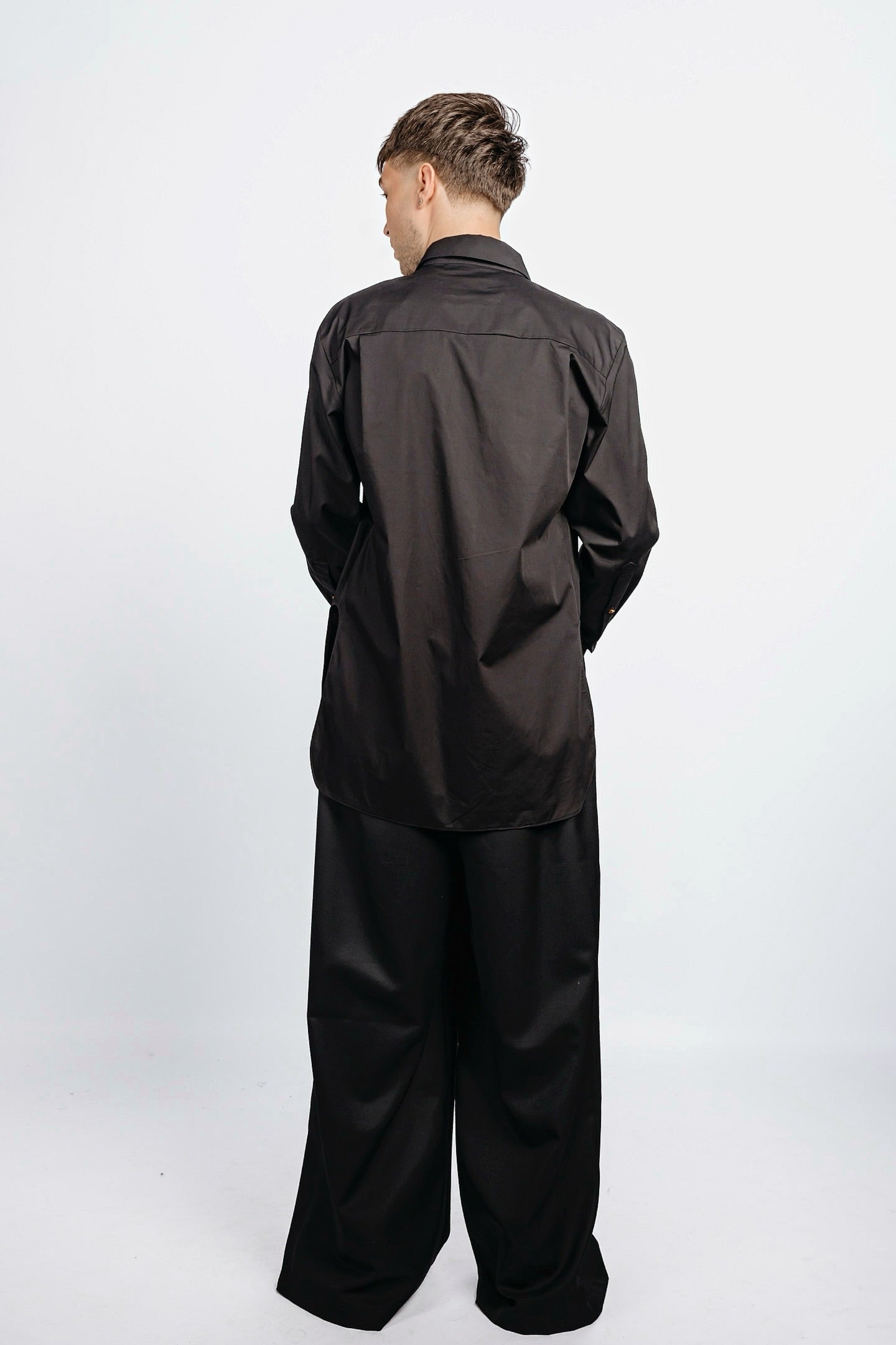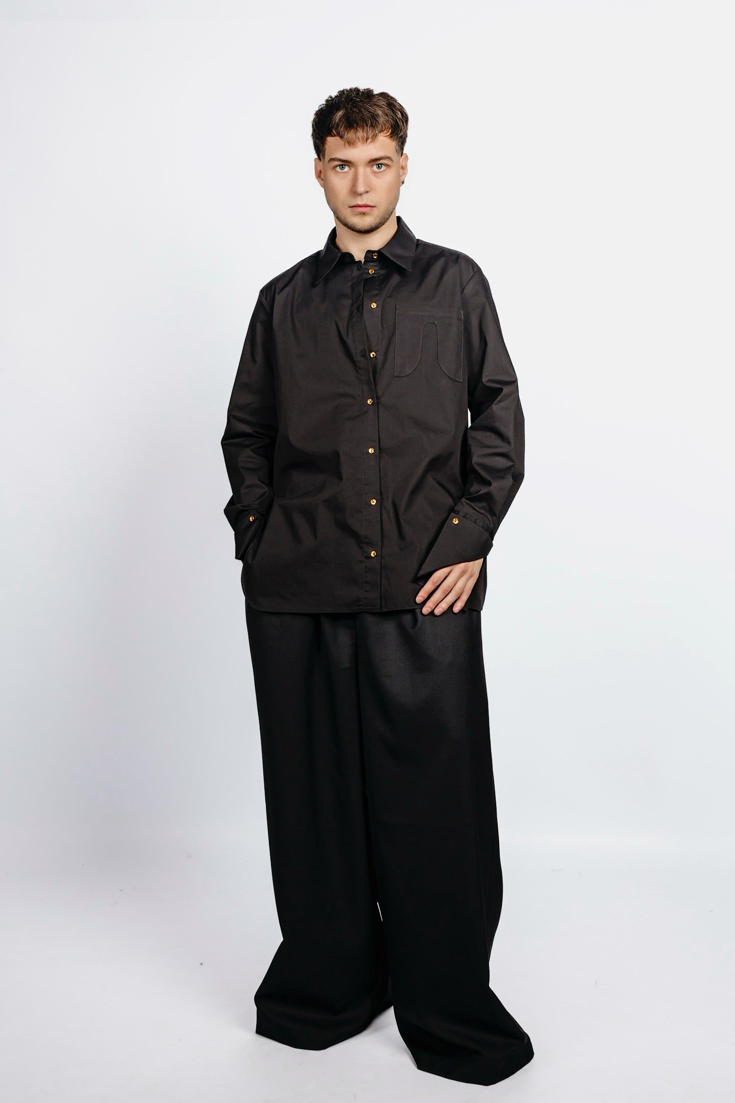 Formal shirt cut with sculpted side notches, echoing a flattened oval shape. Chest pocket mirrors the same incision. Tailored fit, crisp construction.