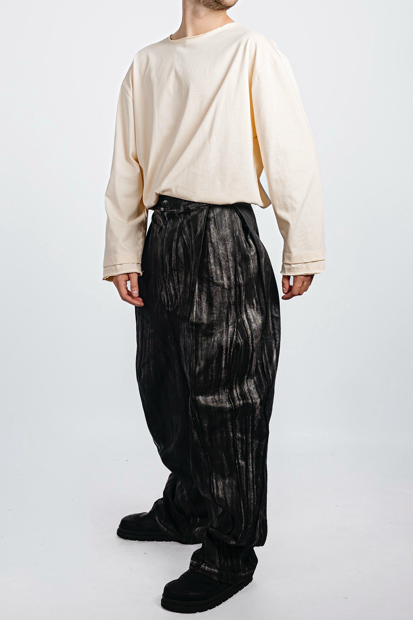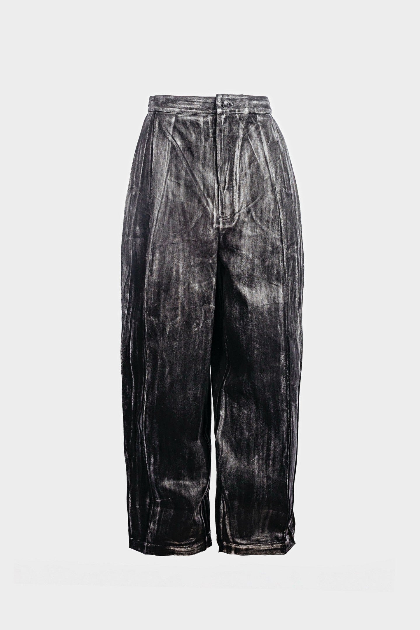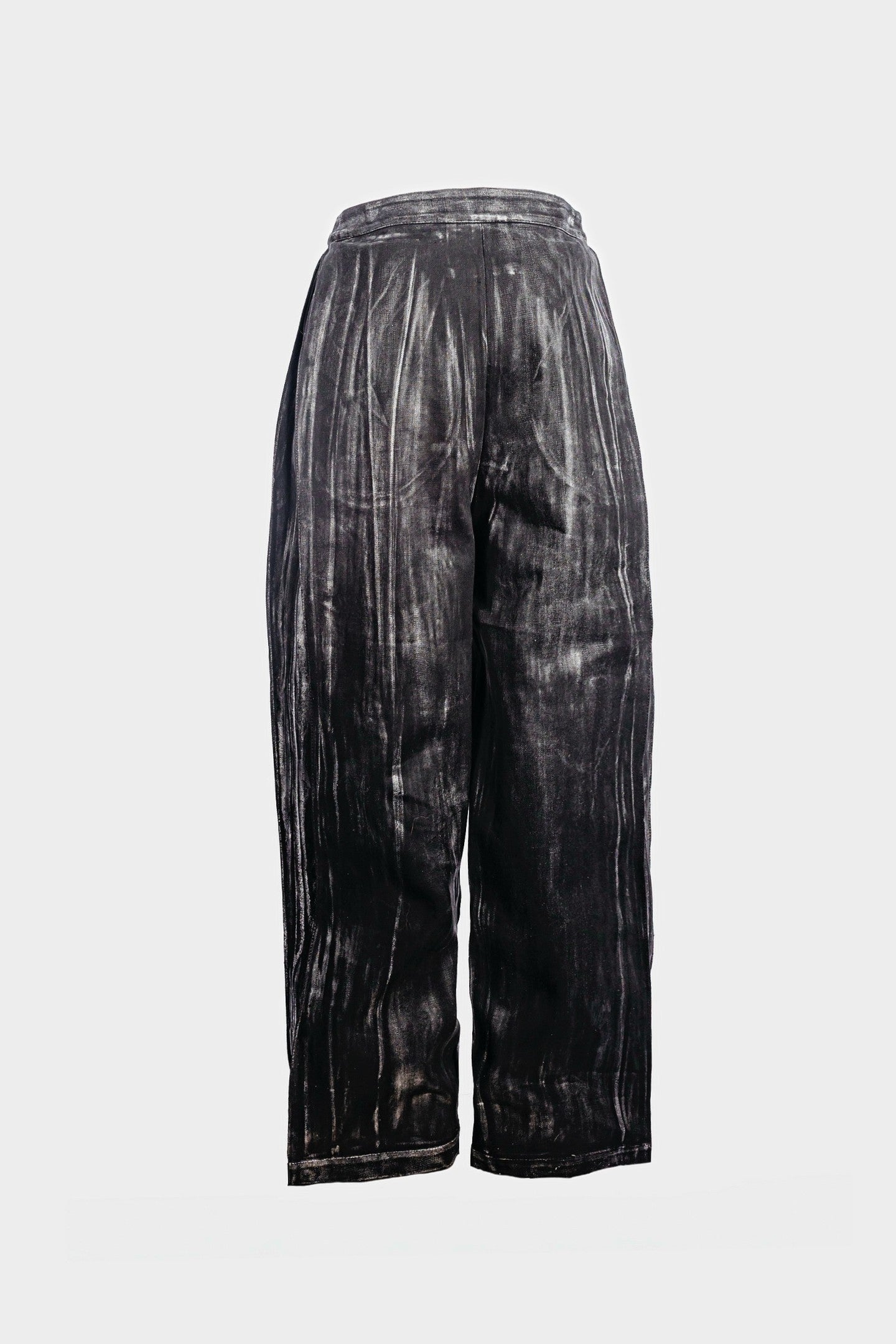 Waxed wide-leg long denim cut with two deep front pleats and clean side pockets tucked between seams. Back pleats enhance the silhouette with controlled depth.
