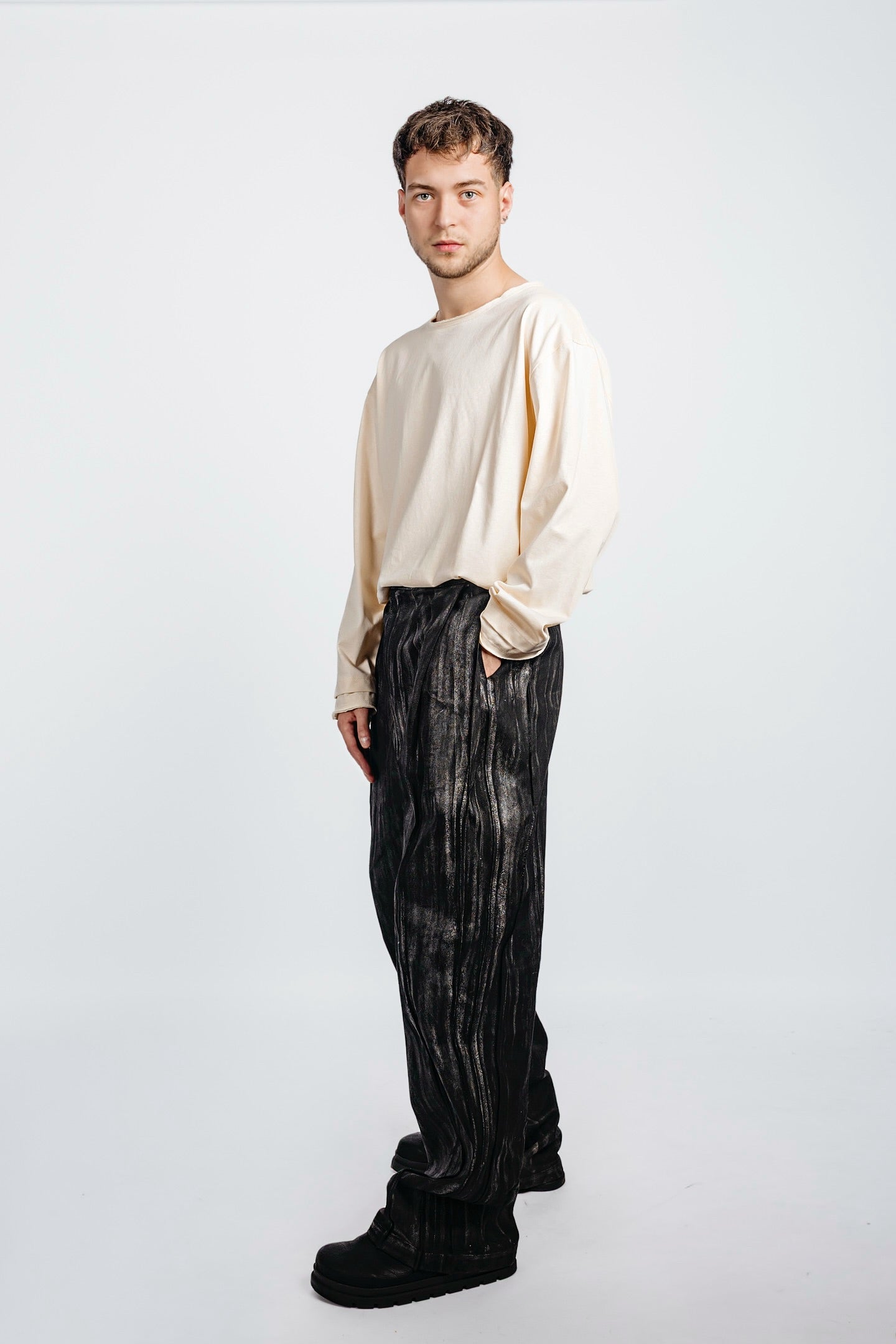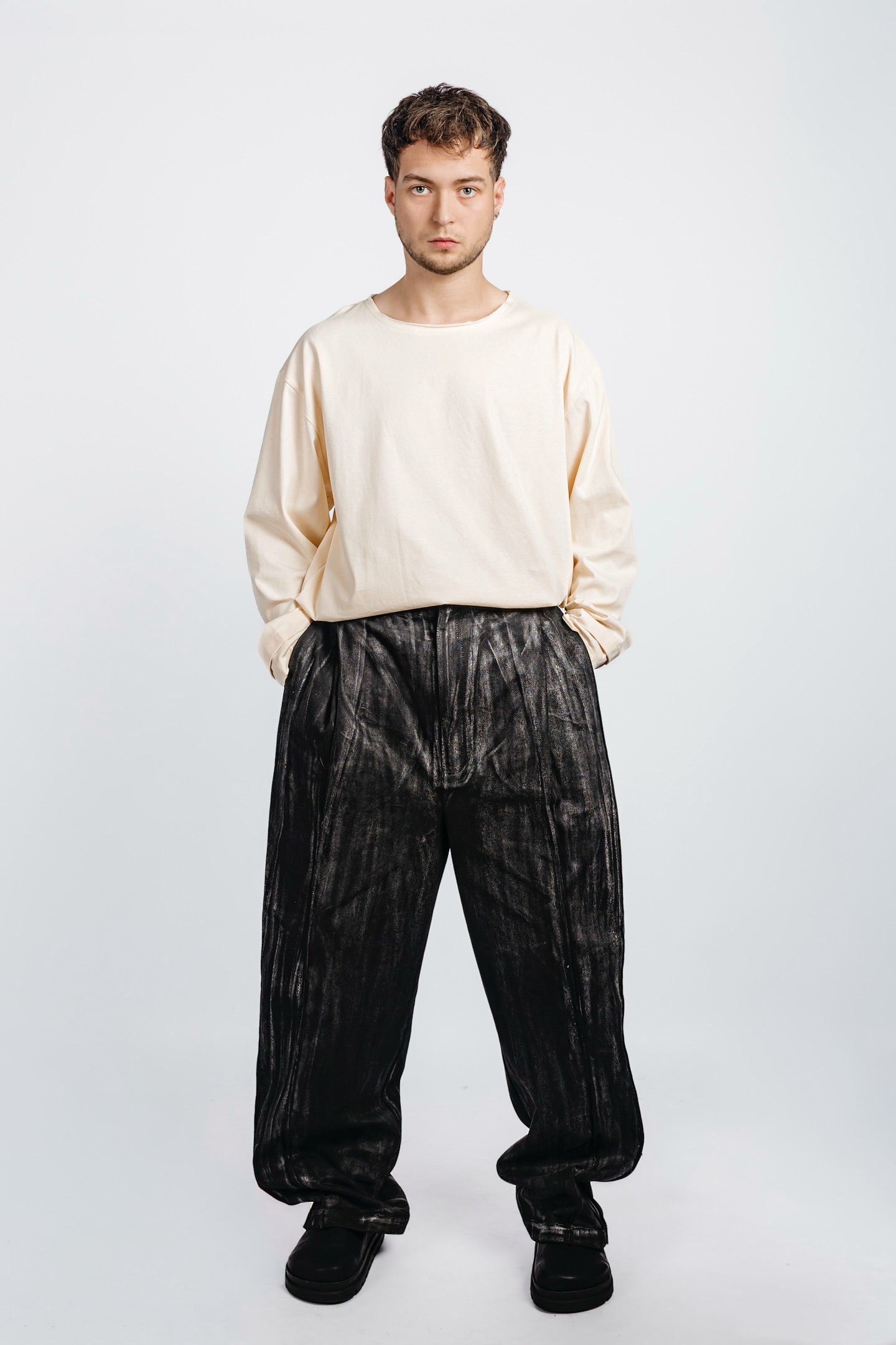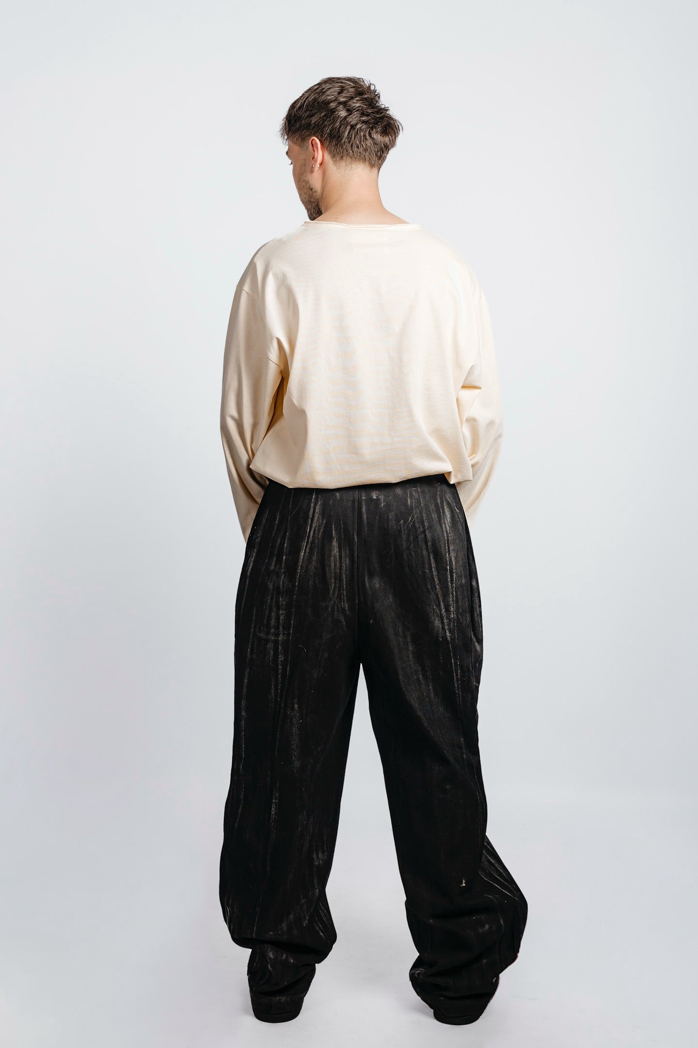 Waxed wide-leg long denim cut with two deep front pleats and clean side pockets tucked between seams. Back pleats enhance the silhouette with controlled depth.