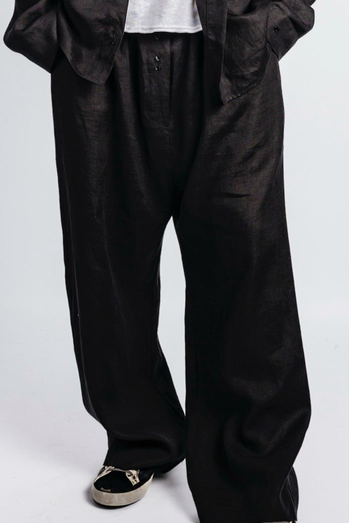 Tailored wide-leg pants in linen, relaxed cut with a soft drape. The waistband sits softly with concealed elastic, while two tonal buttons trace the front with subtle utility. A minimal piece, built for movement and clarity.