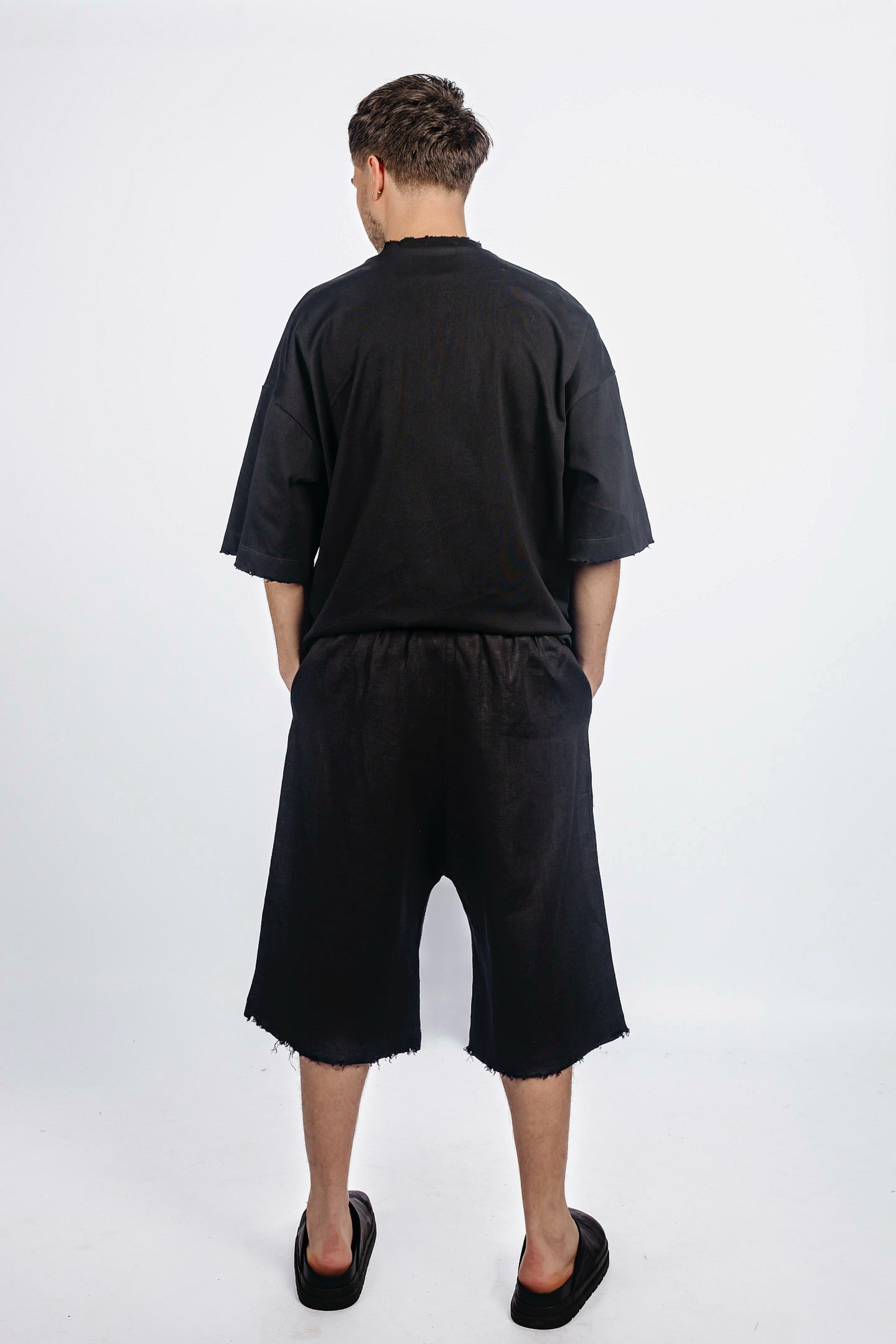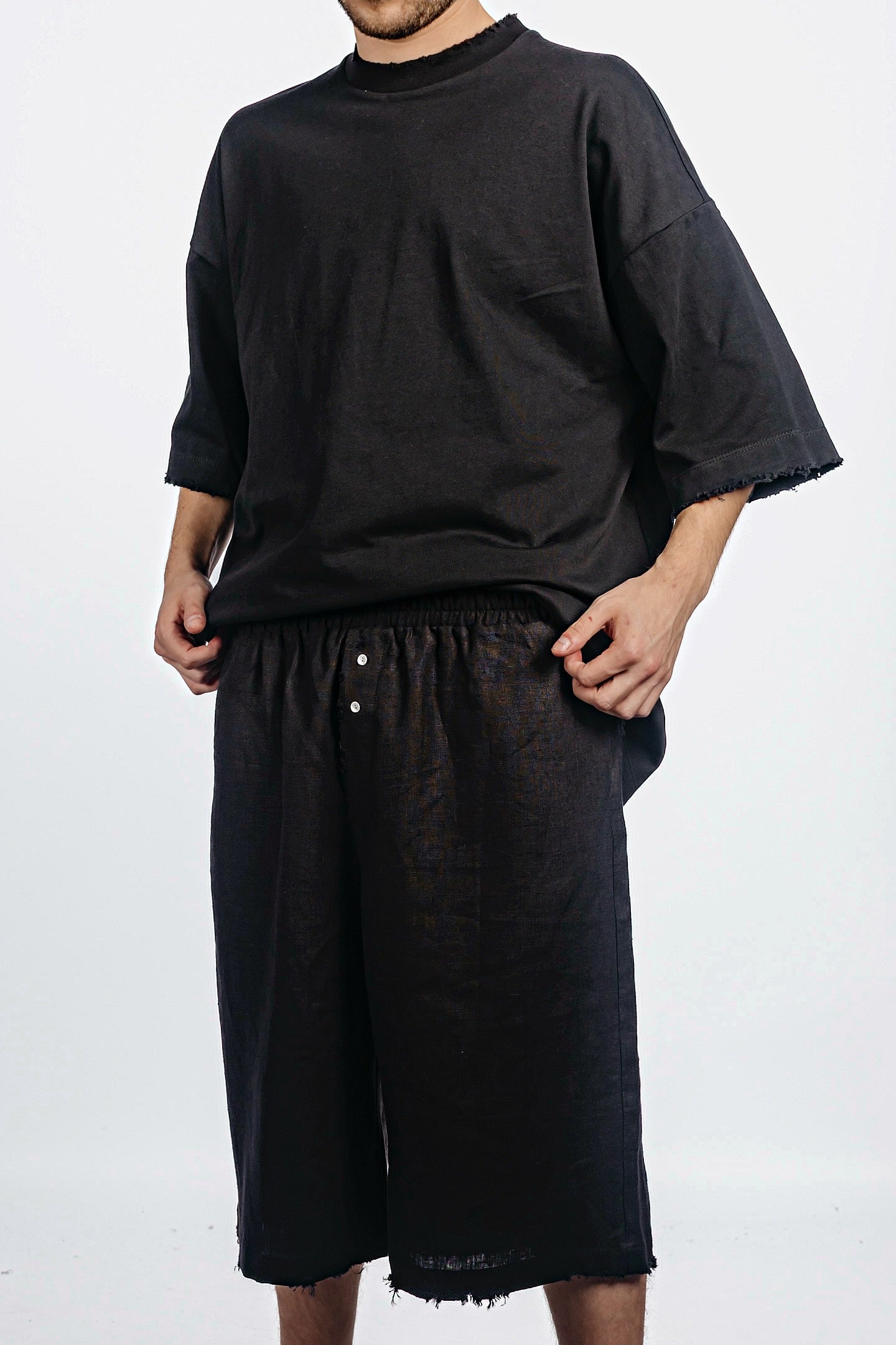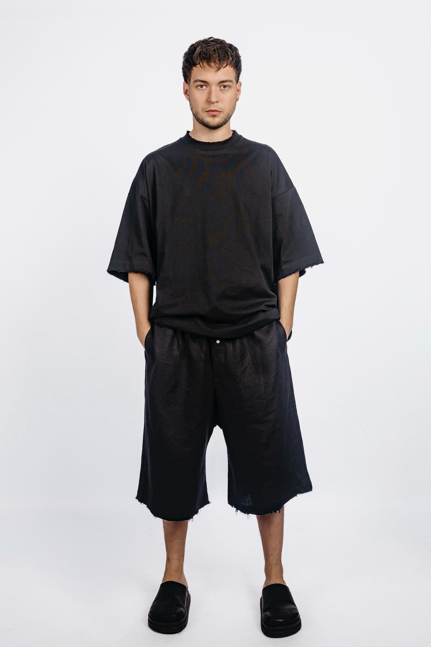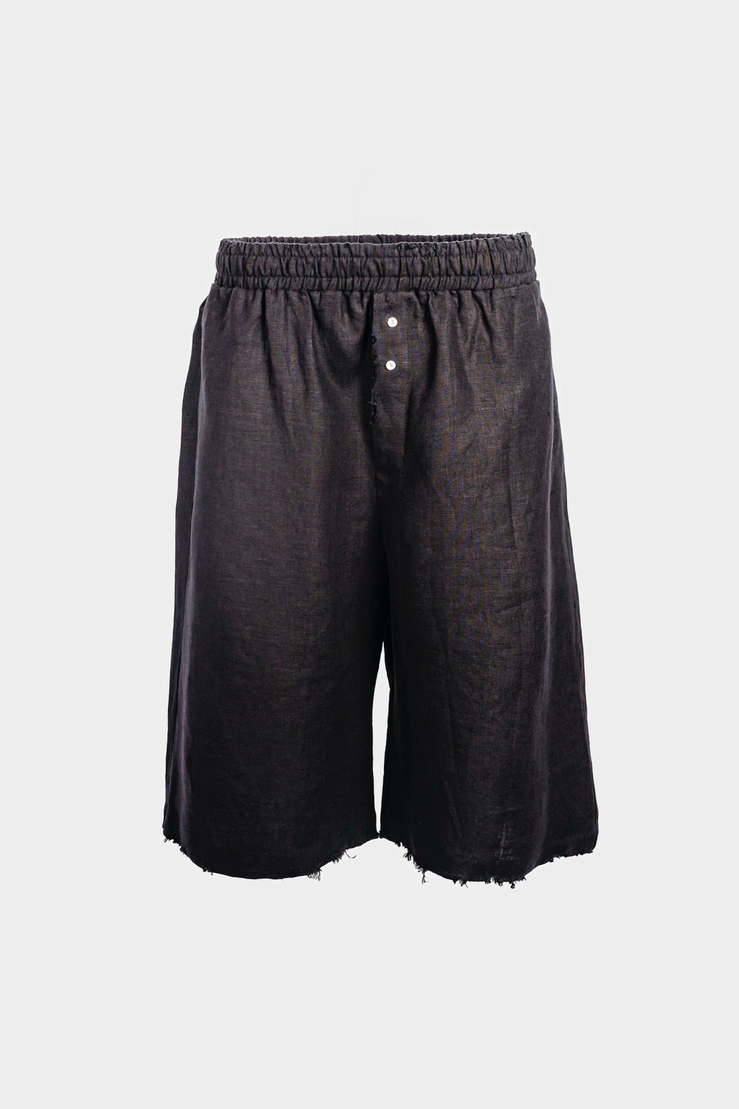 Wide distressed drop-crotch shorts with an oversized cut. Minimal waistband with hidden closure. Slightly lowered rise for an insouciant fit.
