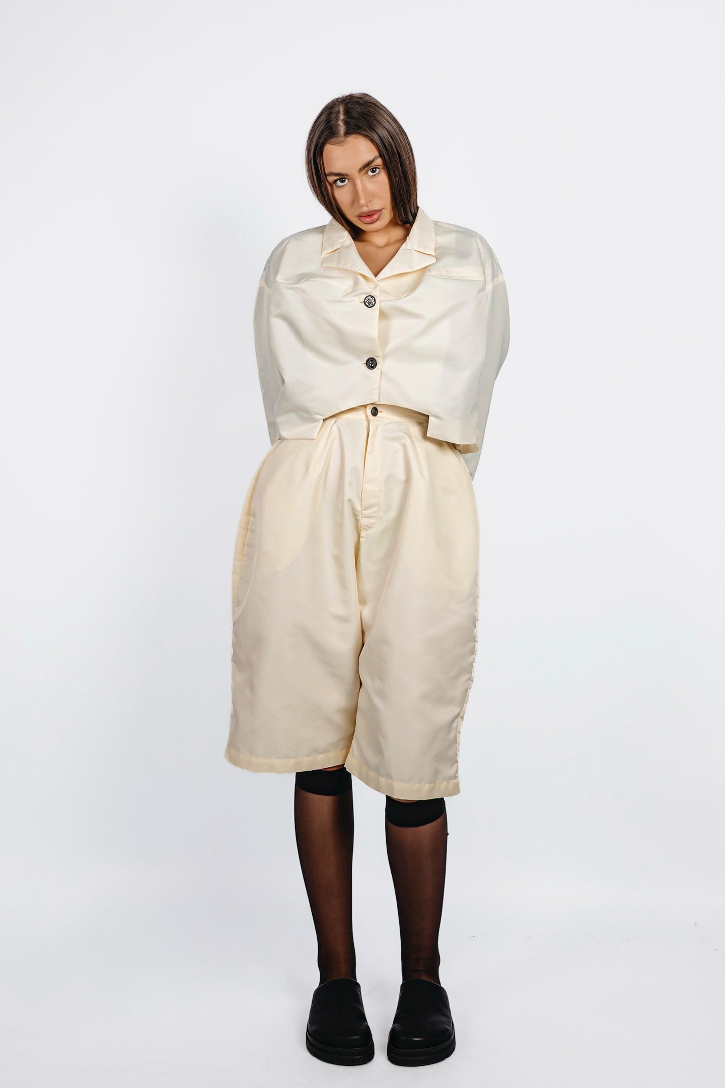 Oval-cut high-waisted nylon pants falling just below the knee, with a roomy silhouette. Featuring discreet side pockets and wide hems for a clean, refined look.