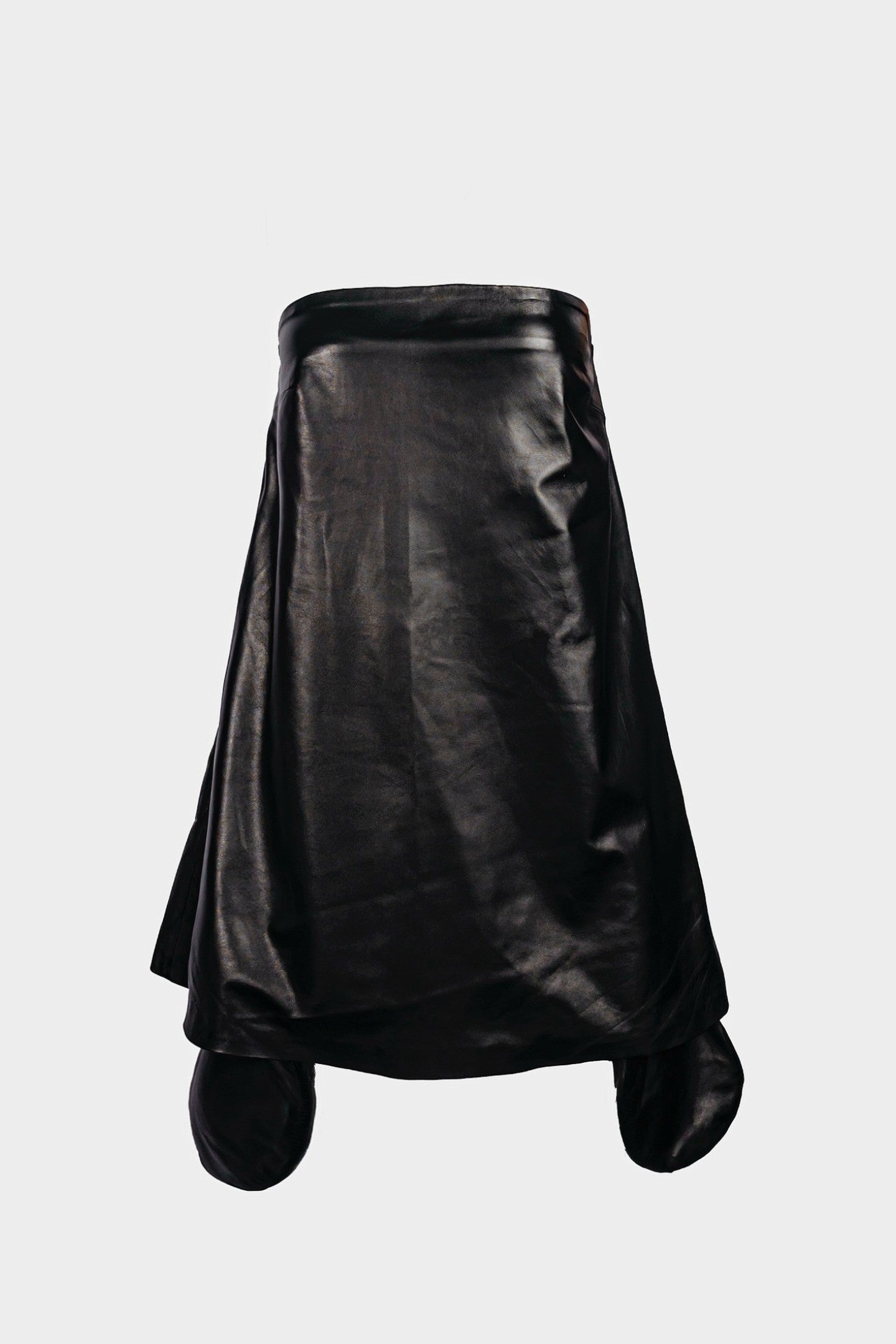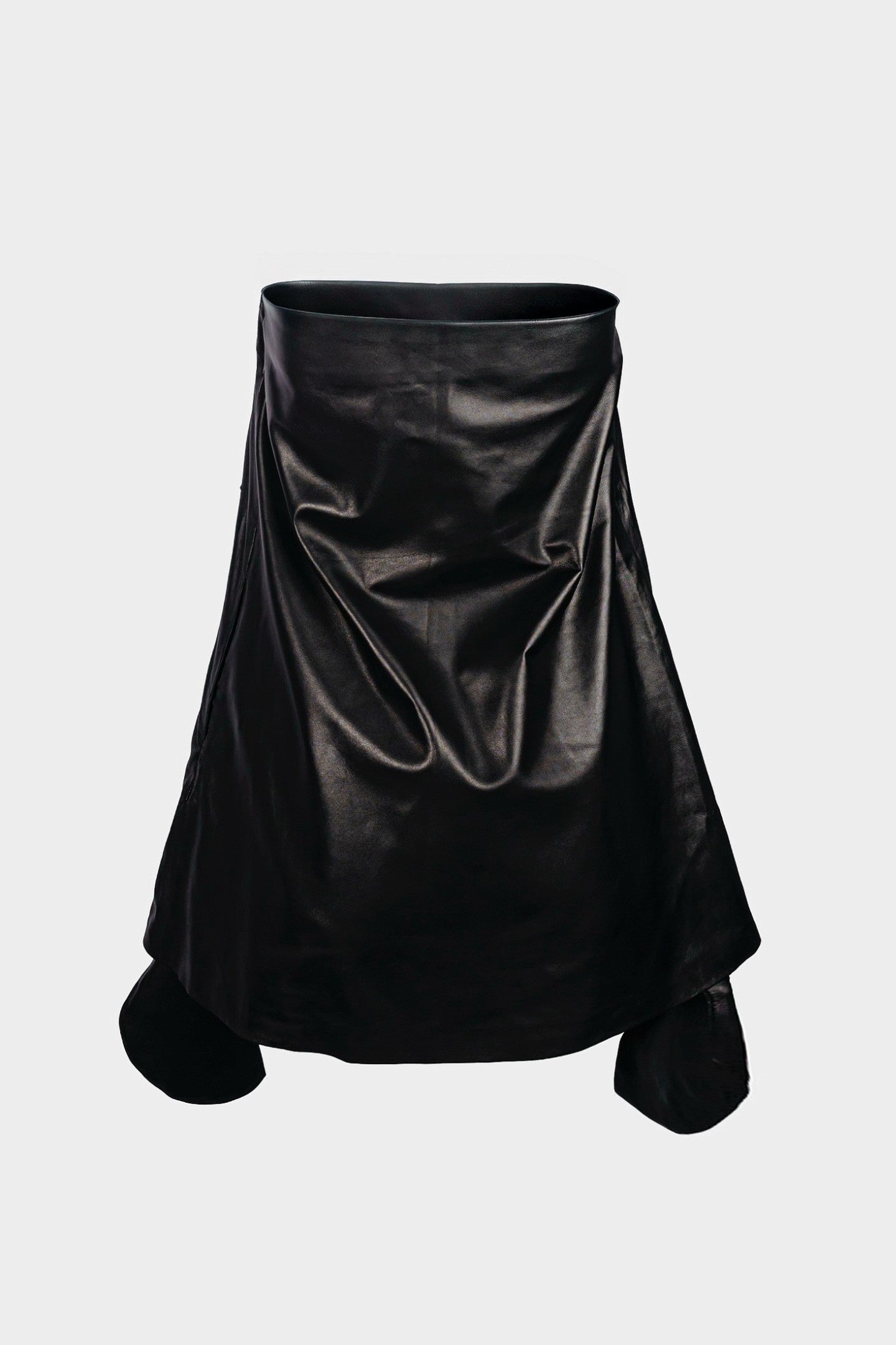 Strapless sculpted mini dress in black calfskin, with curved side panels and a straight, engineered hemline.