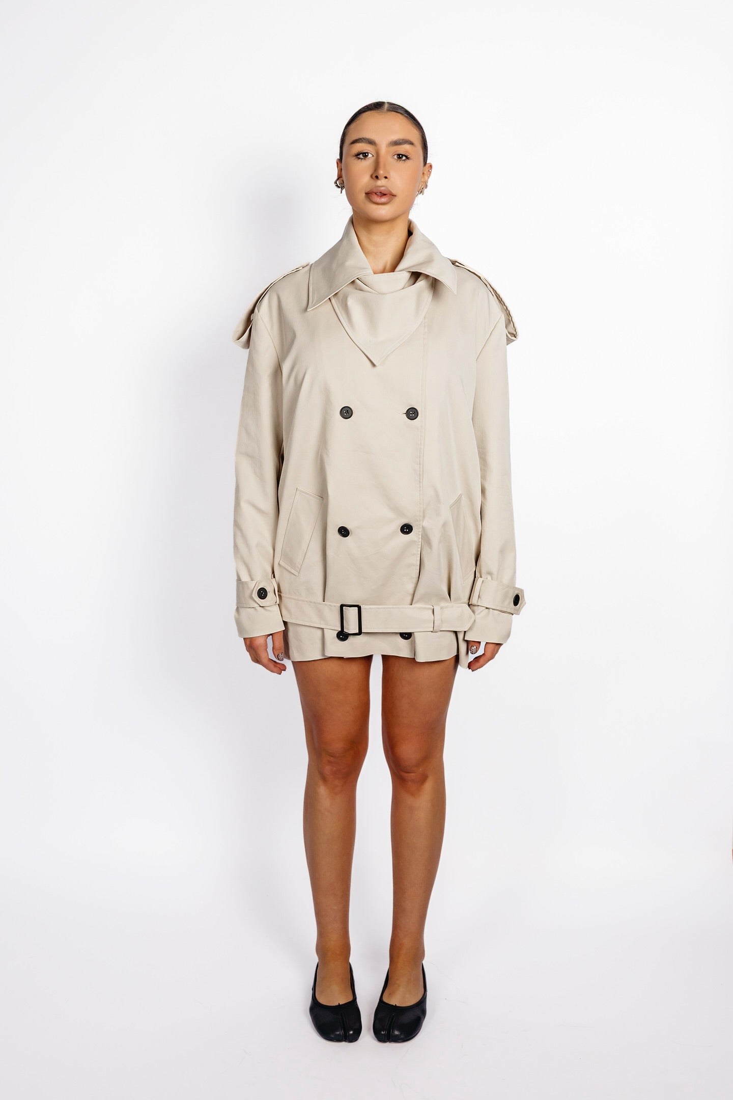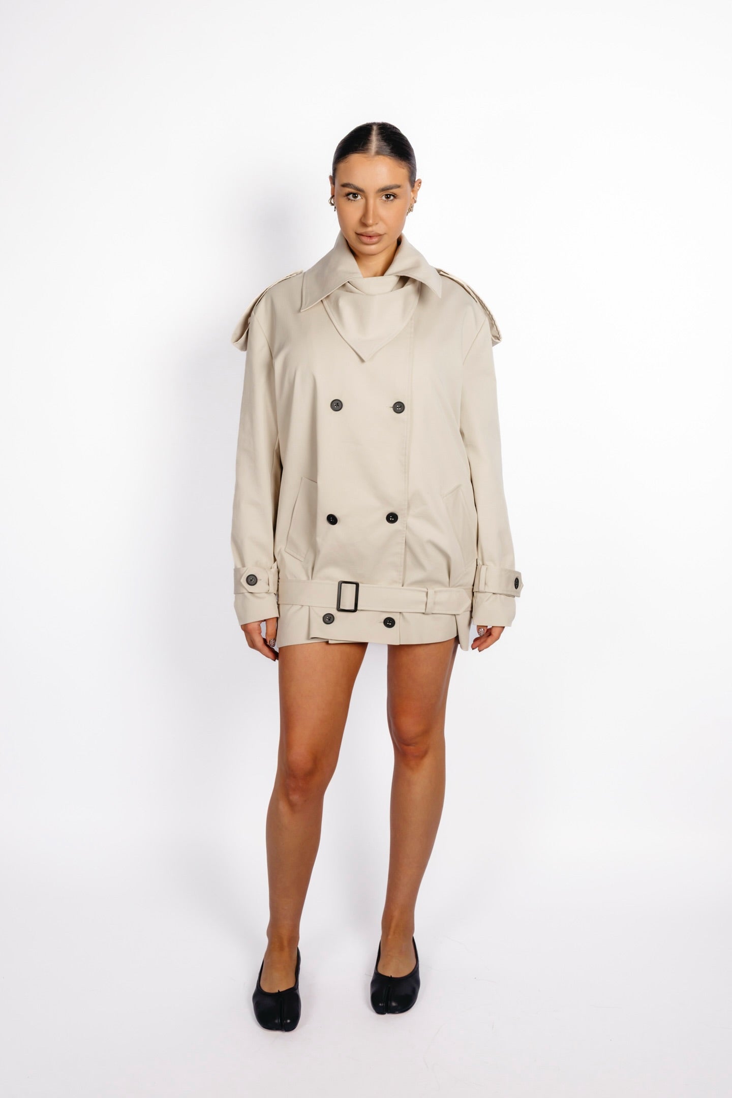 Double-breasted trench with a sculpted high-neck triangle and a detachable waist cord. Features sharp buttoned details at the collar, oversized lapels, and a tailored silhouette that falls just below the hips.
