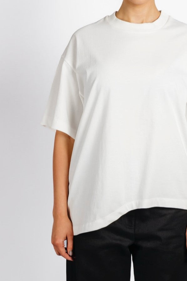 Cropped t-shirt with an unexpected wave. Cut with a loose, boxy fit that sits around the waist, the hem dips asymmetrically to one side, creating a sculptural drape that moves with the body. Clean neckline, minimal finish, and no embellishments—just pure, directional form.