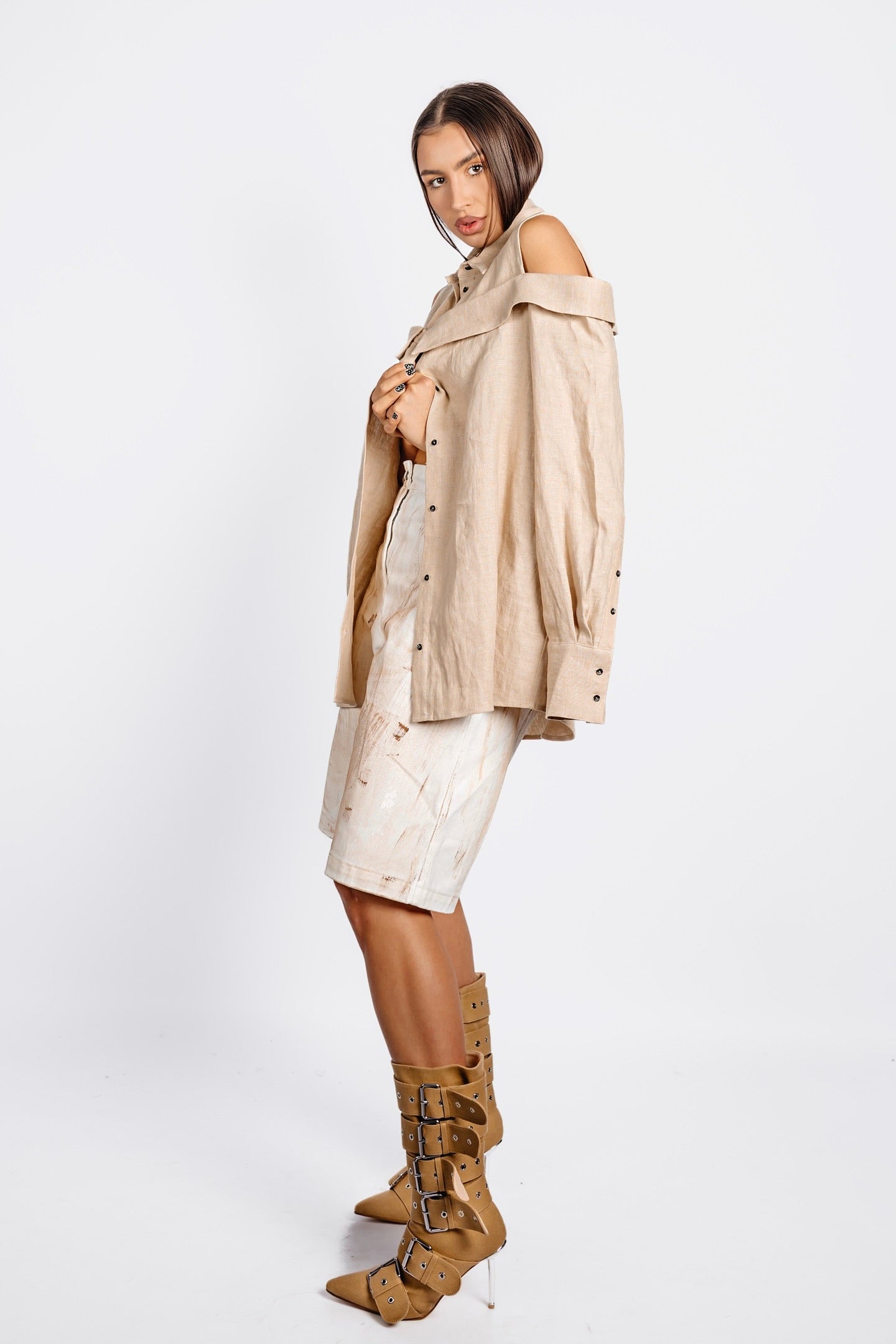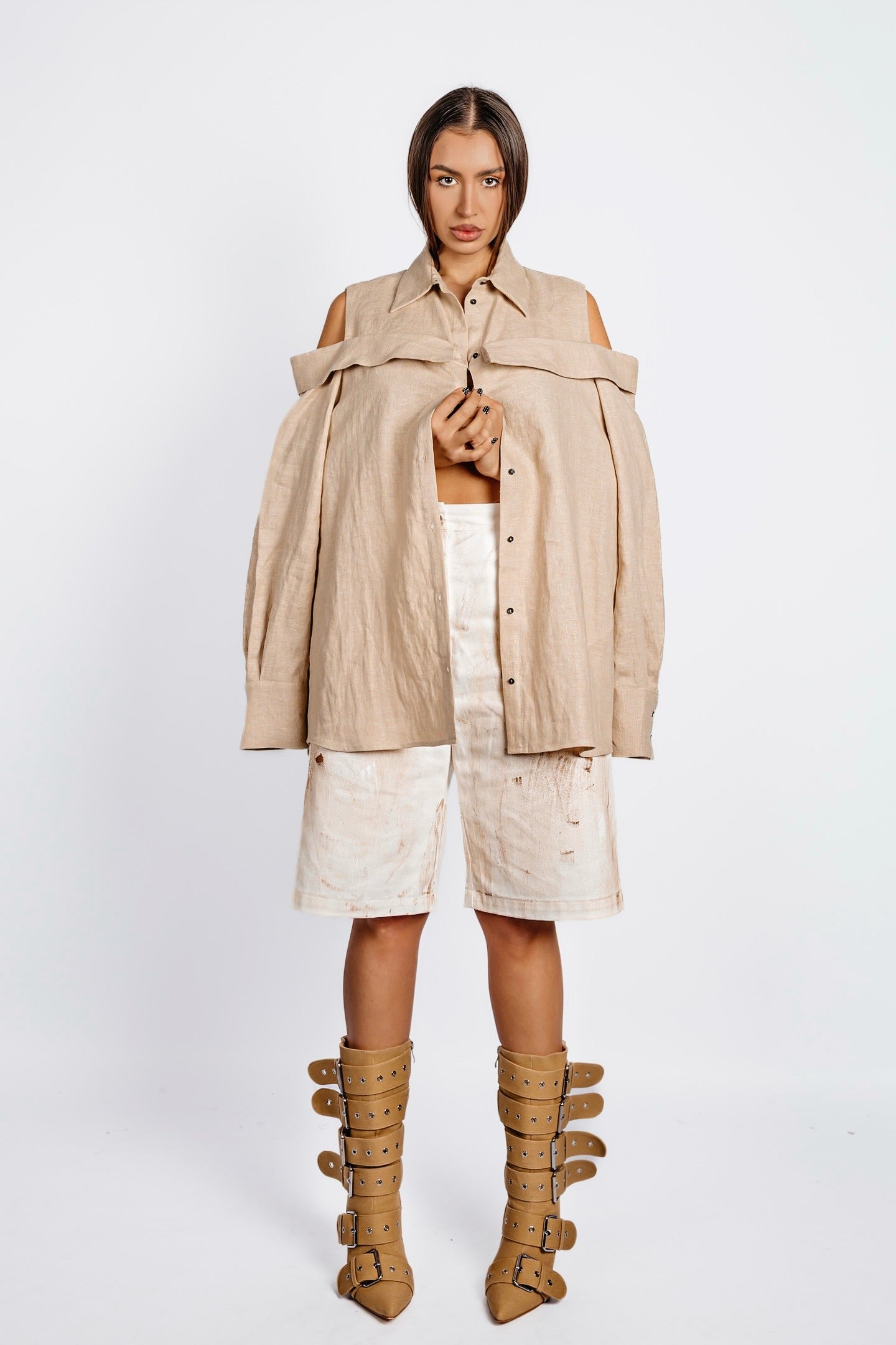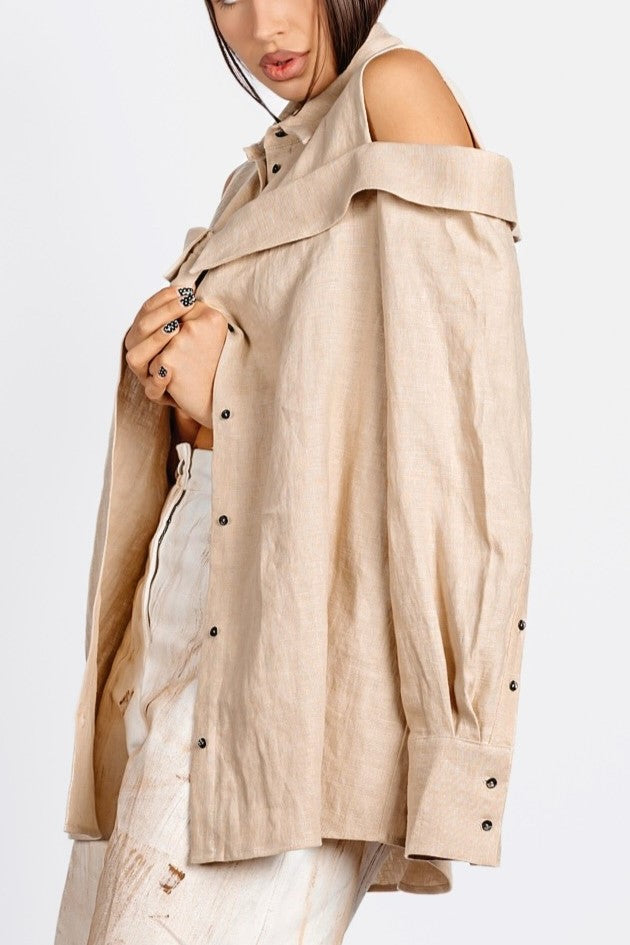 Oversized long shirt cut with a double-collar construction—one at the neck, the other encircling the shoulders. A clean-cut shoulder insert opens the sleeve between the structured shoulder and secondary collar, adding structure to the relaxed silhouette. Functional slits at the cuffs punctuate the elongated sleeves. Precise, unconventional, and unapologetically bold.