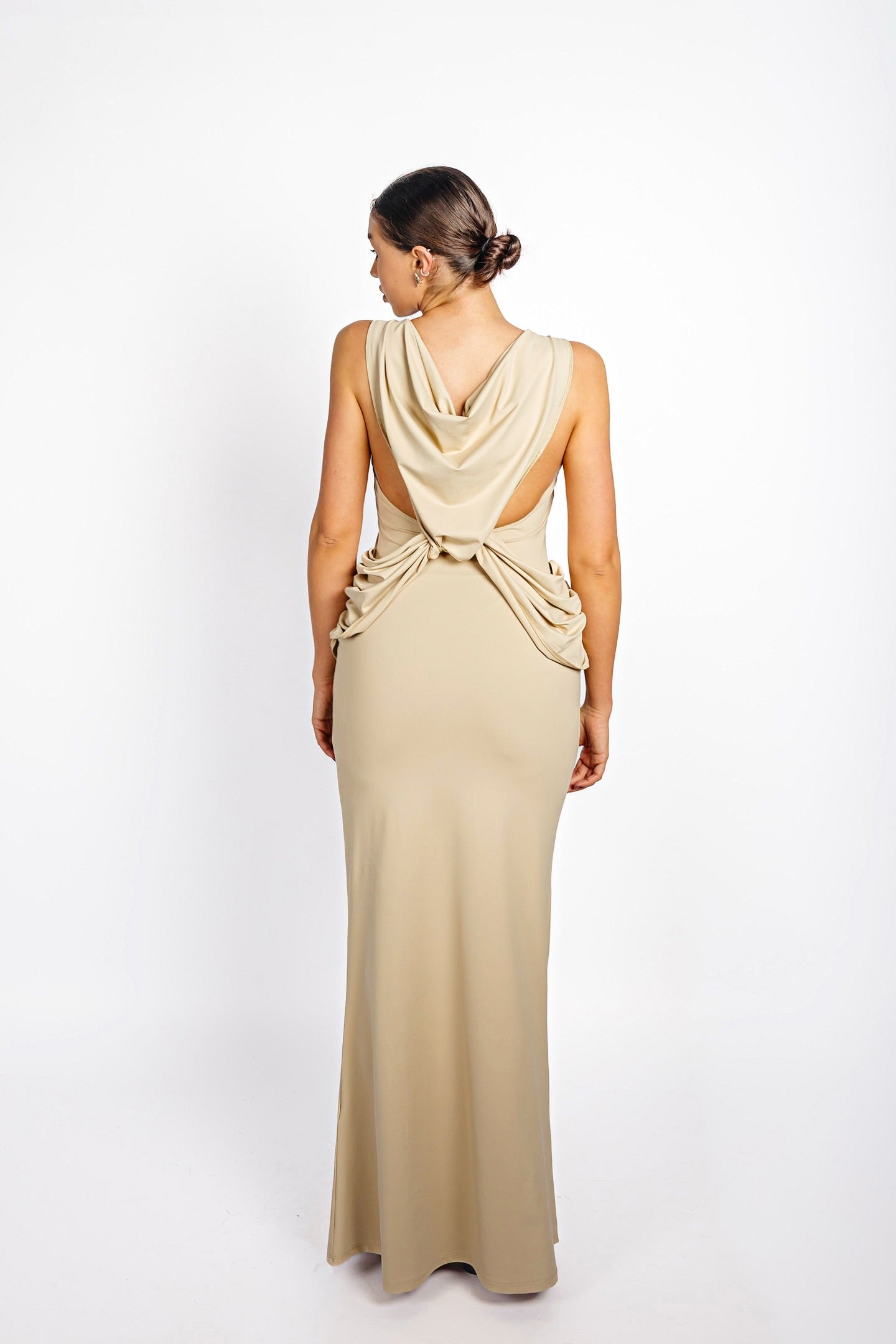 Floor-length dress defined by a draped panel that wraps across the hips and cinches at the front with a soft knot. The gathered fabric continues along the back, without interruption, creating a sculpted curve. From the rear panel, a single strap extends upward and fastens at the shoulder, tracing a line across the back.