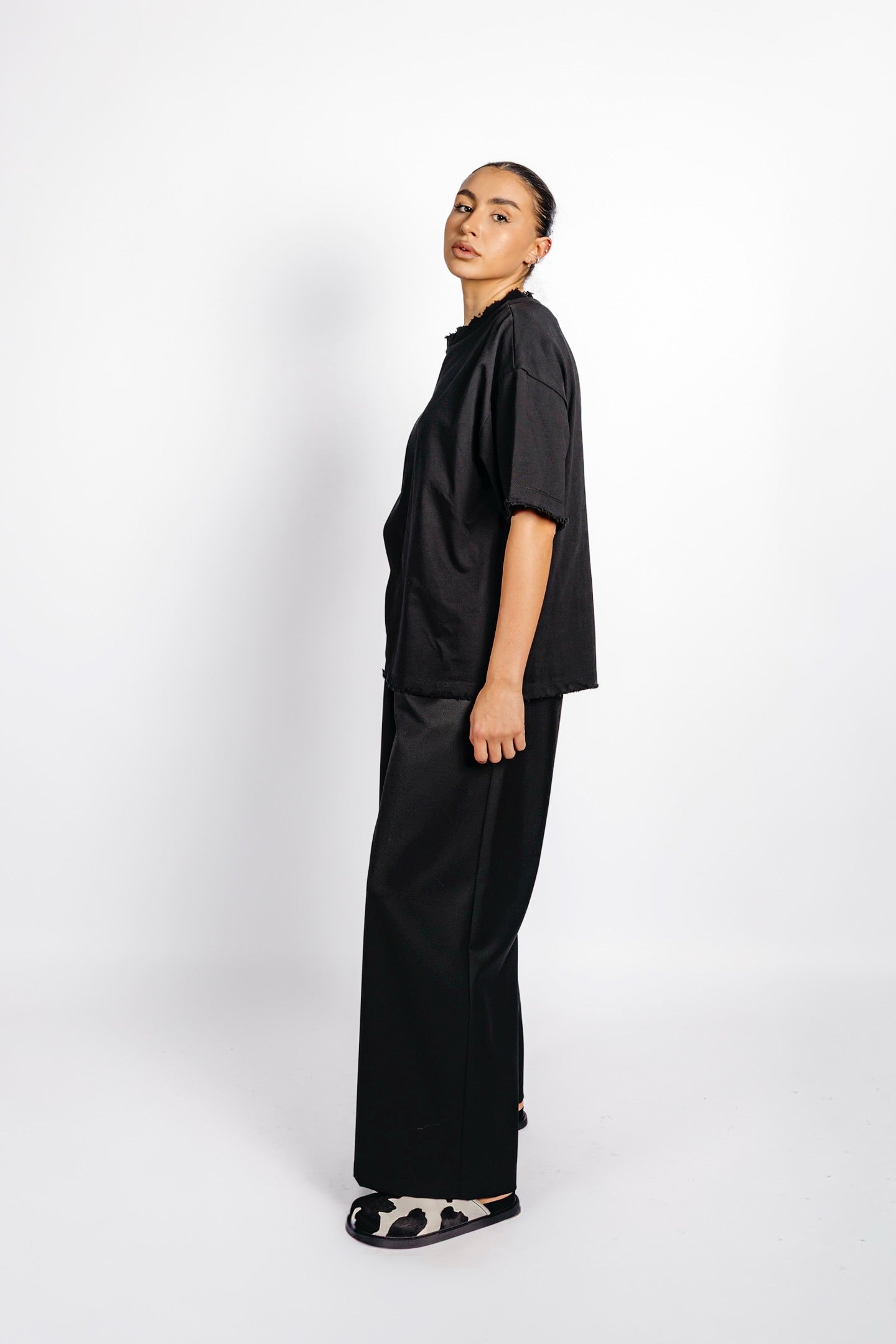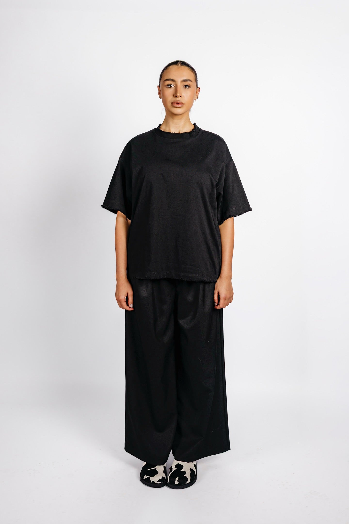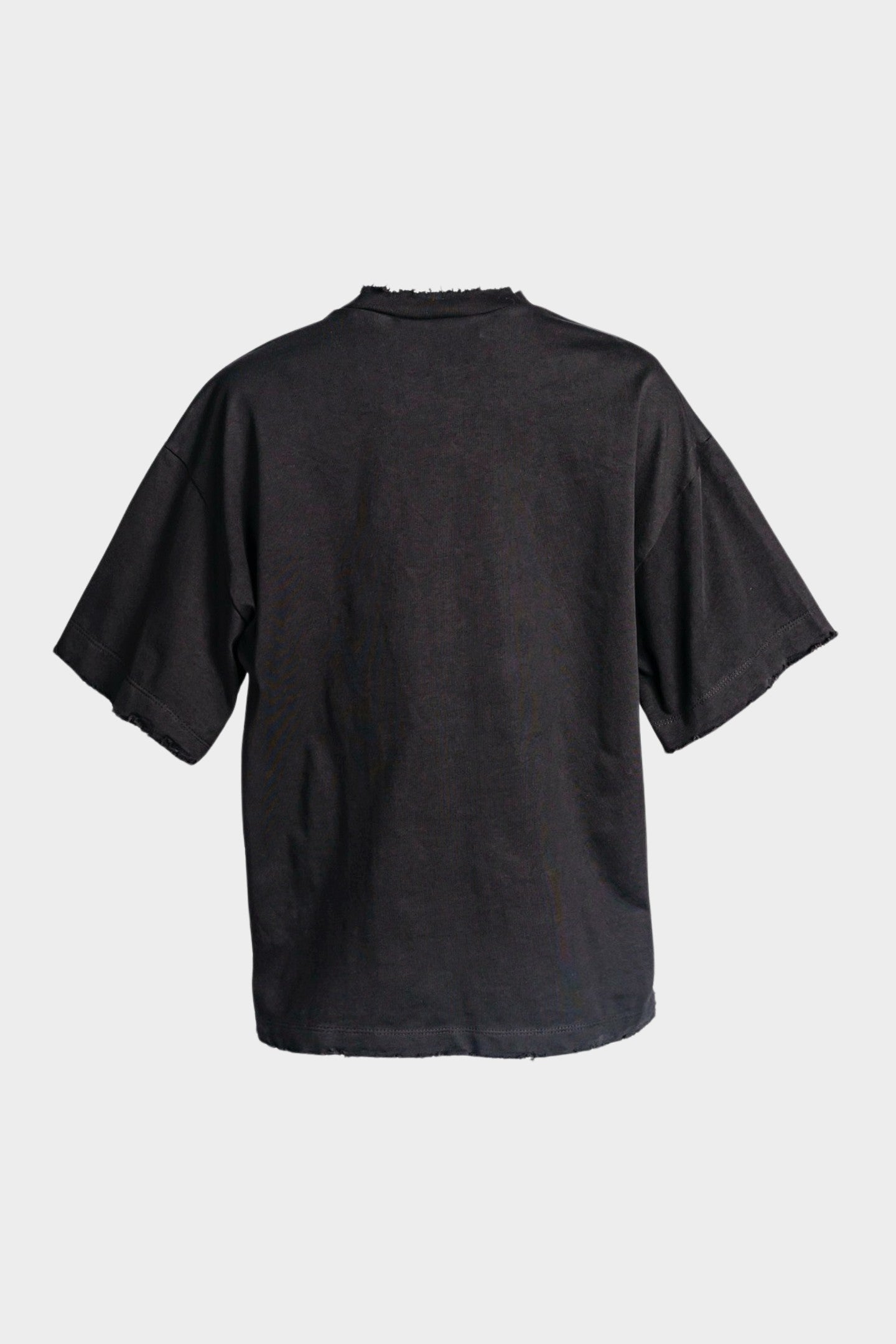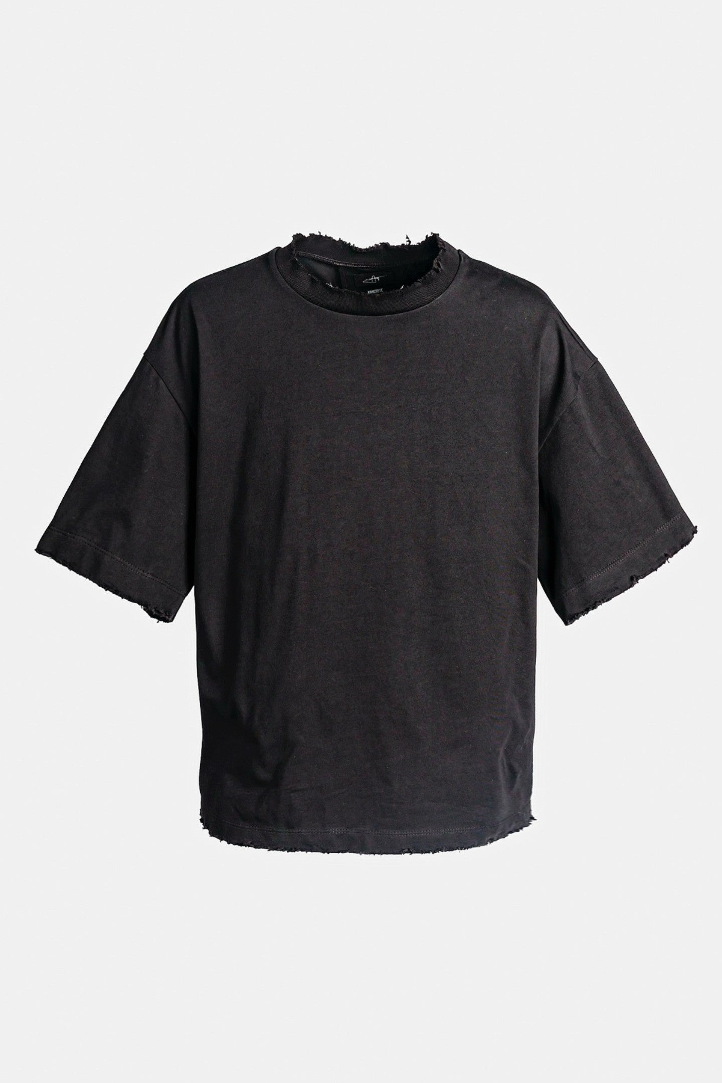 Boxy distressed cropped T-shirt with an exaggerated crewneck finished in heavy rib. The neckline sits wide and open, framing the collarbones. Constructed with clean shoulders and a straight torso for a squared fit.