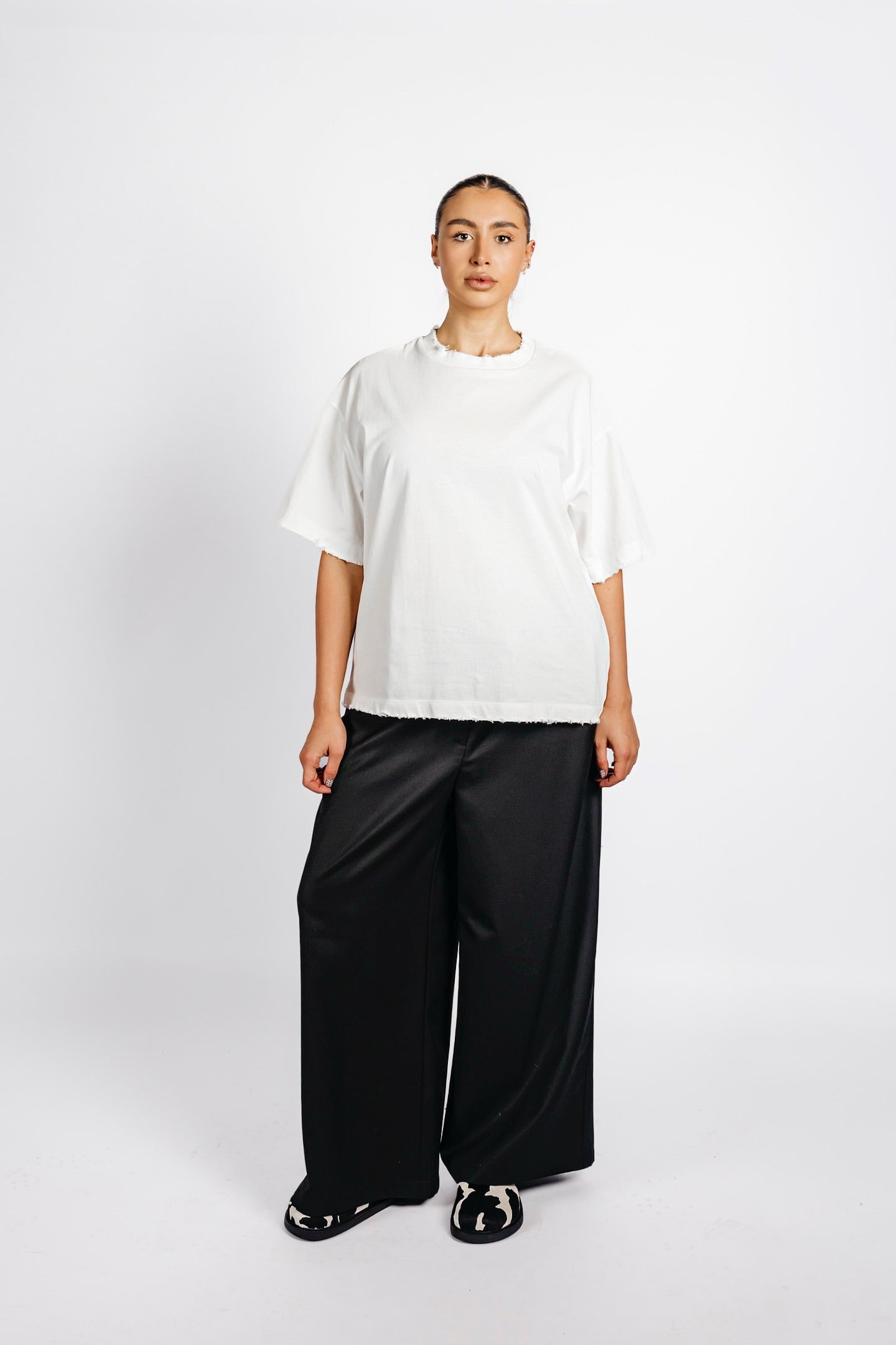 Boxy distressed cropped T-shirt with an exaggerated crewneck finished in heavy rib. The neckline sits wide and open, framing the collarbones. Constructed with clean shoulders and a straight torso for a squared fit.