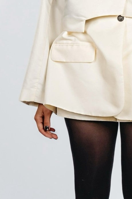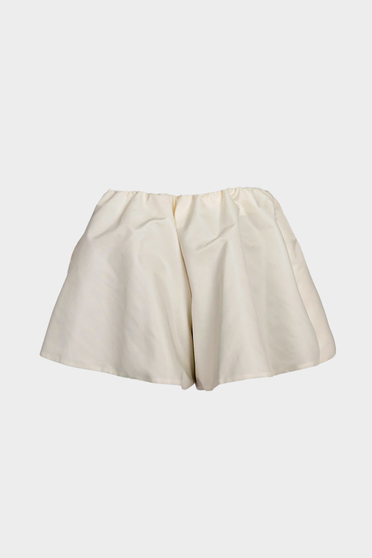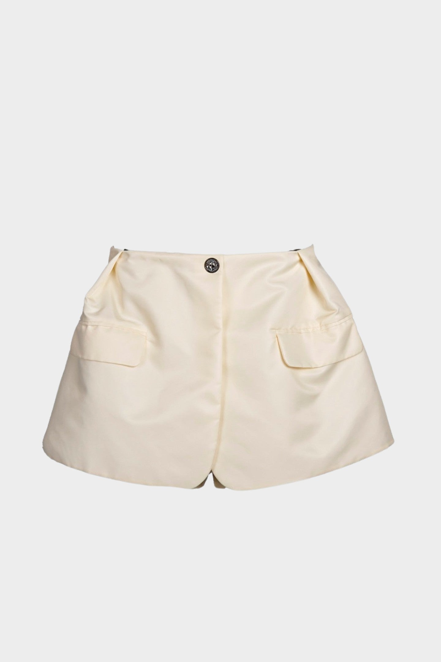 High-rised pants in nylon with full lining, Features two side panels extending from the outer seams, folding across the front, creating a layered skirt-like effect.