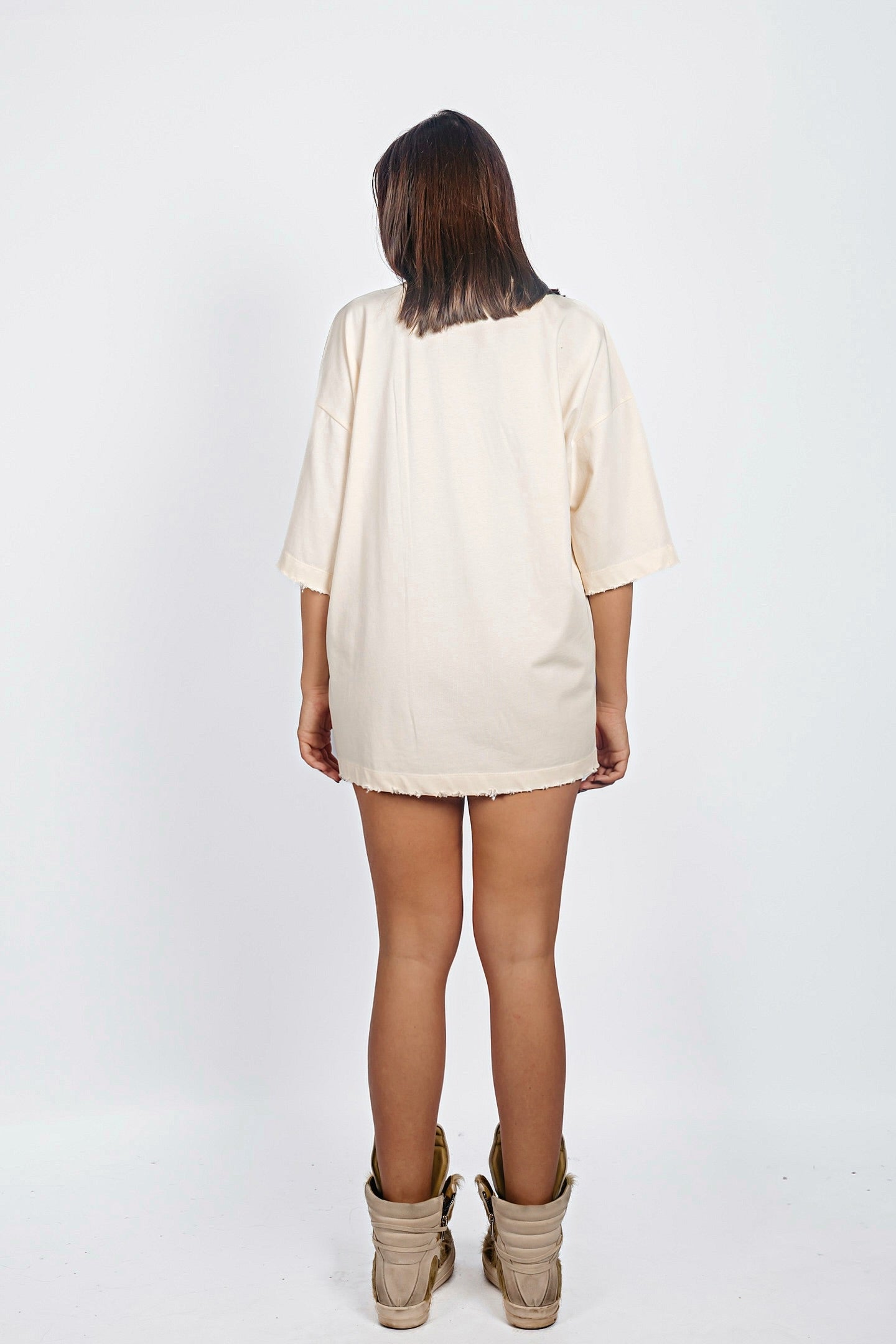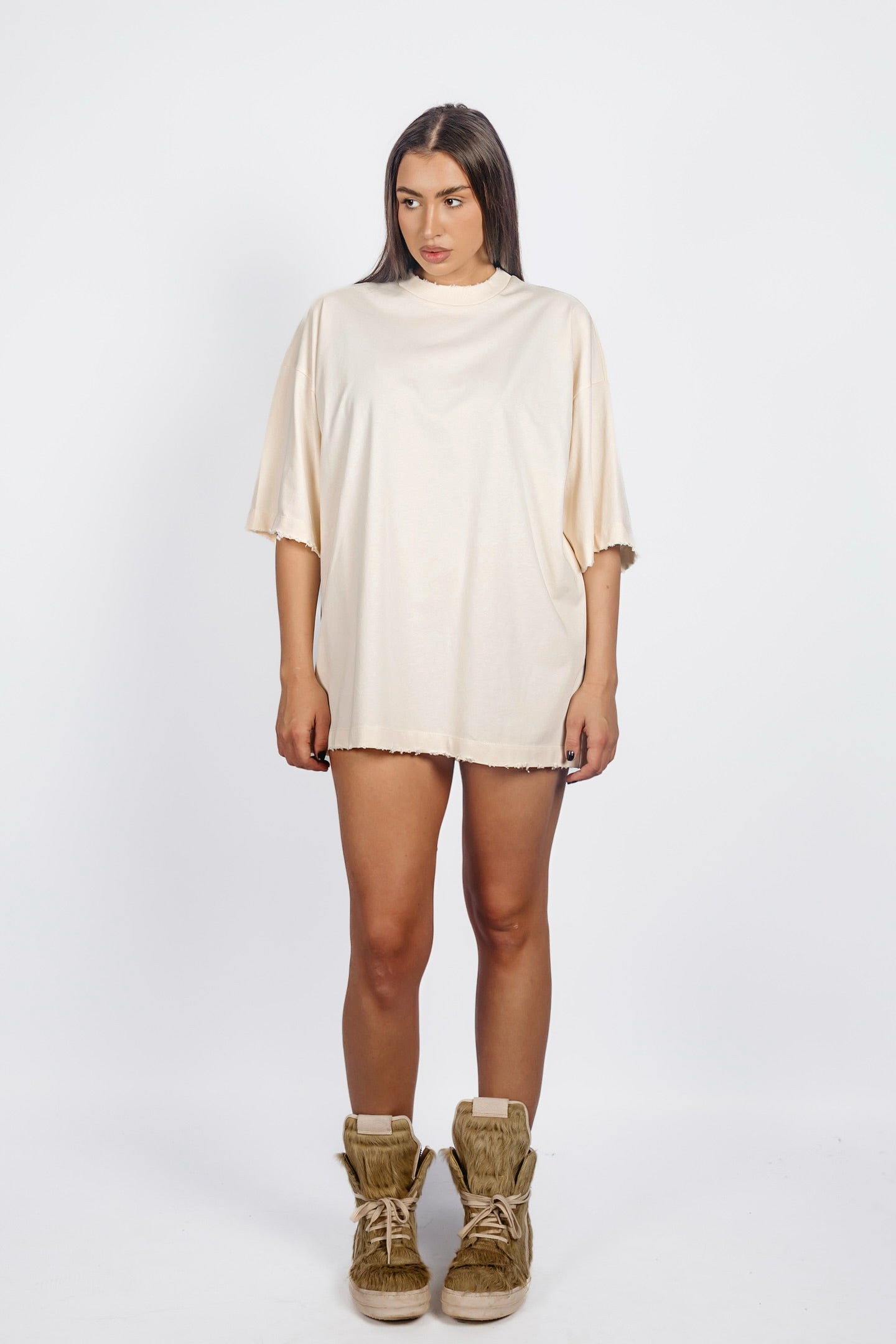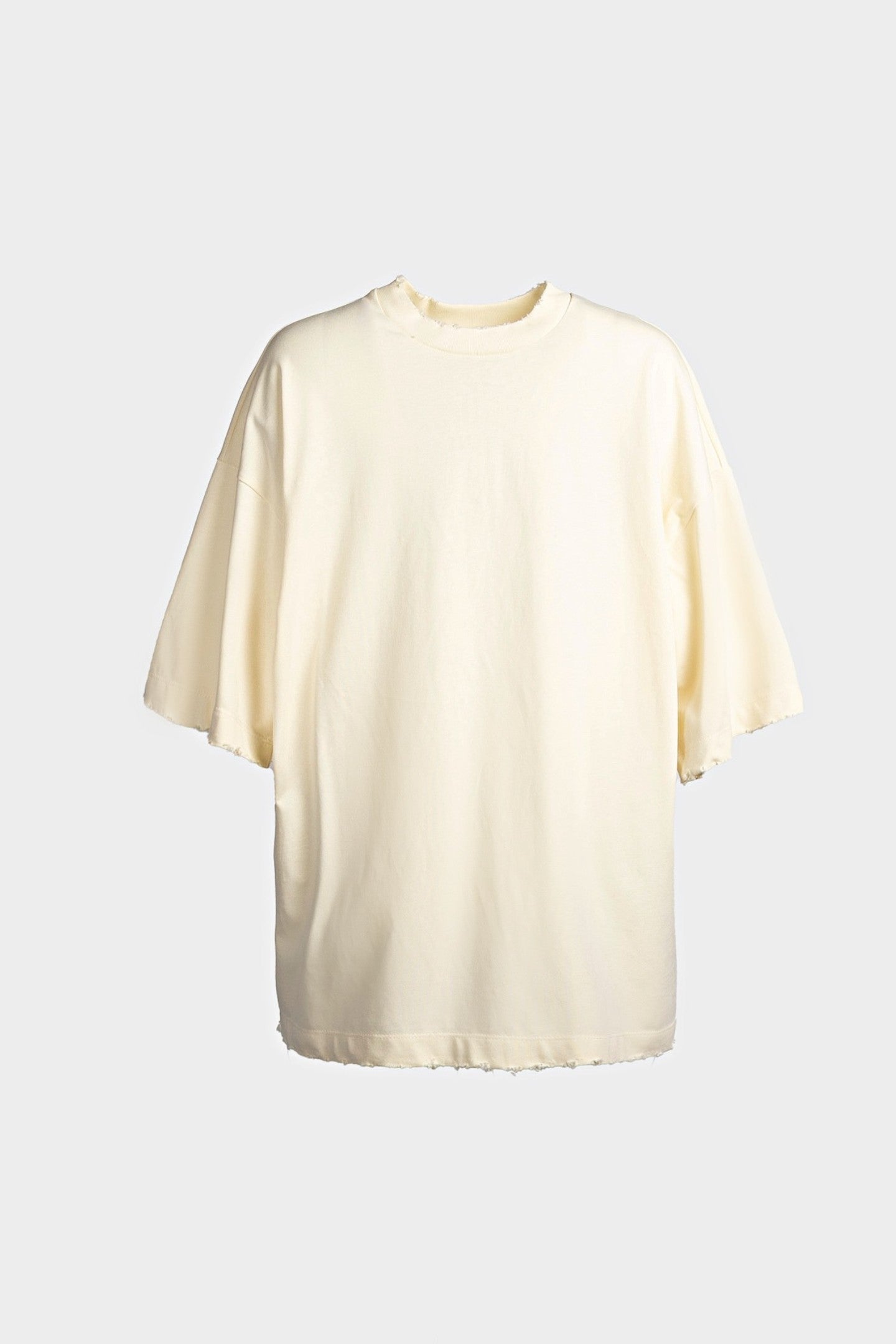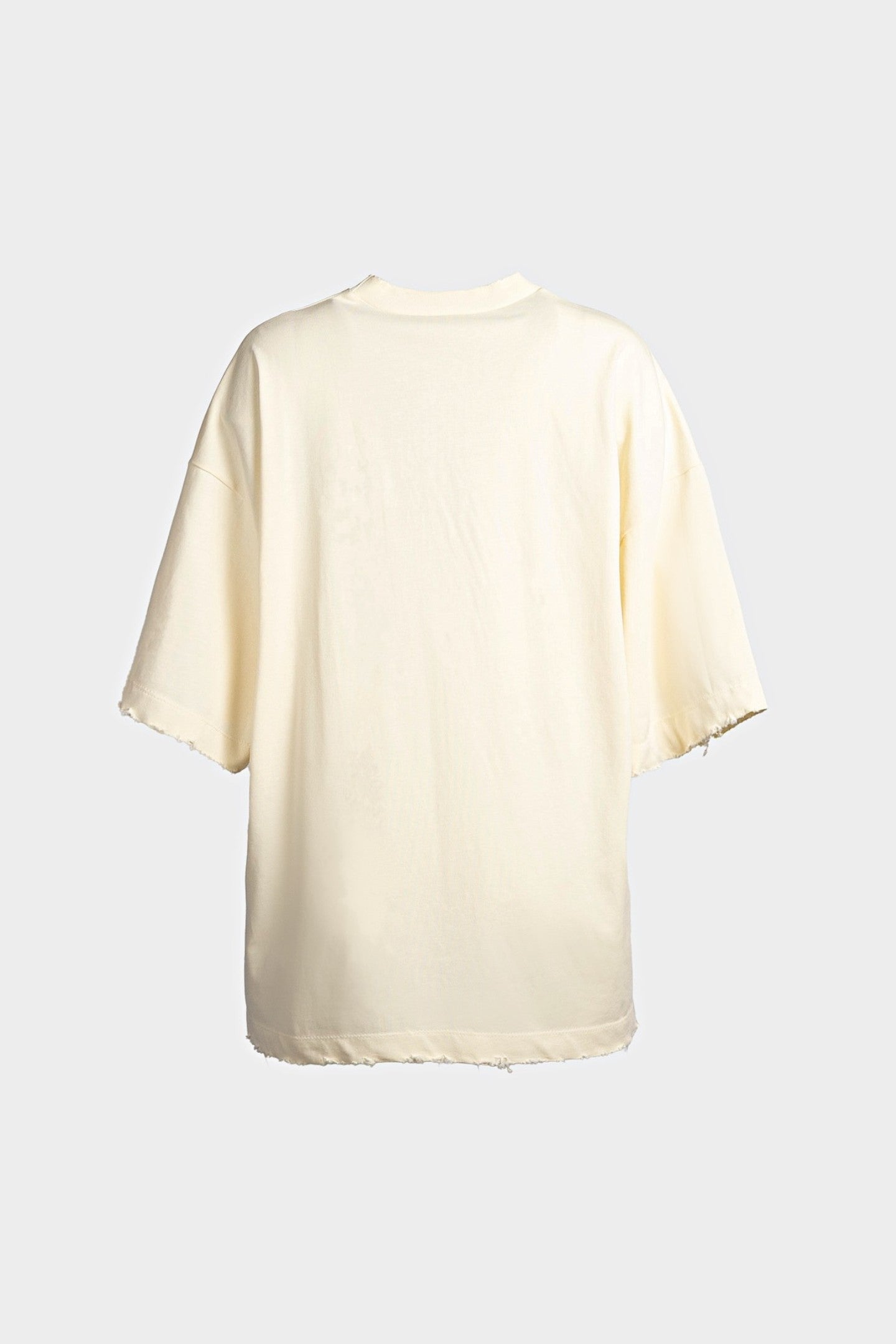 Distressed oversized T-shirt in structured cotton jersey with a dropped shoulder line and elongated cut. Finished with a ribbed crewneck and refined edge stitching.