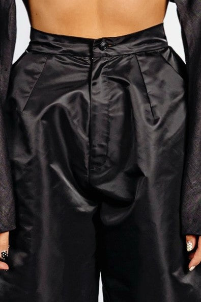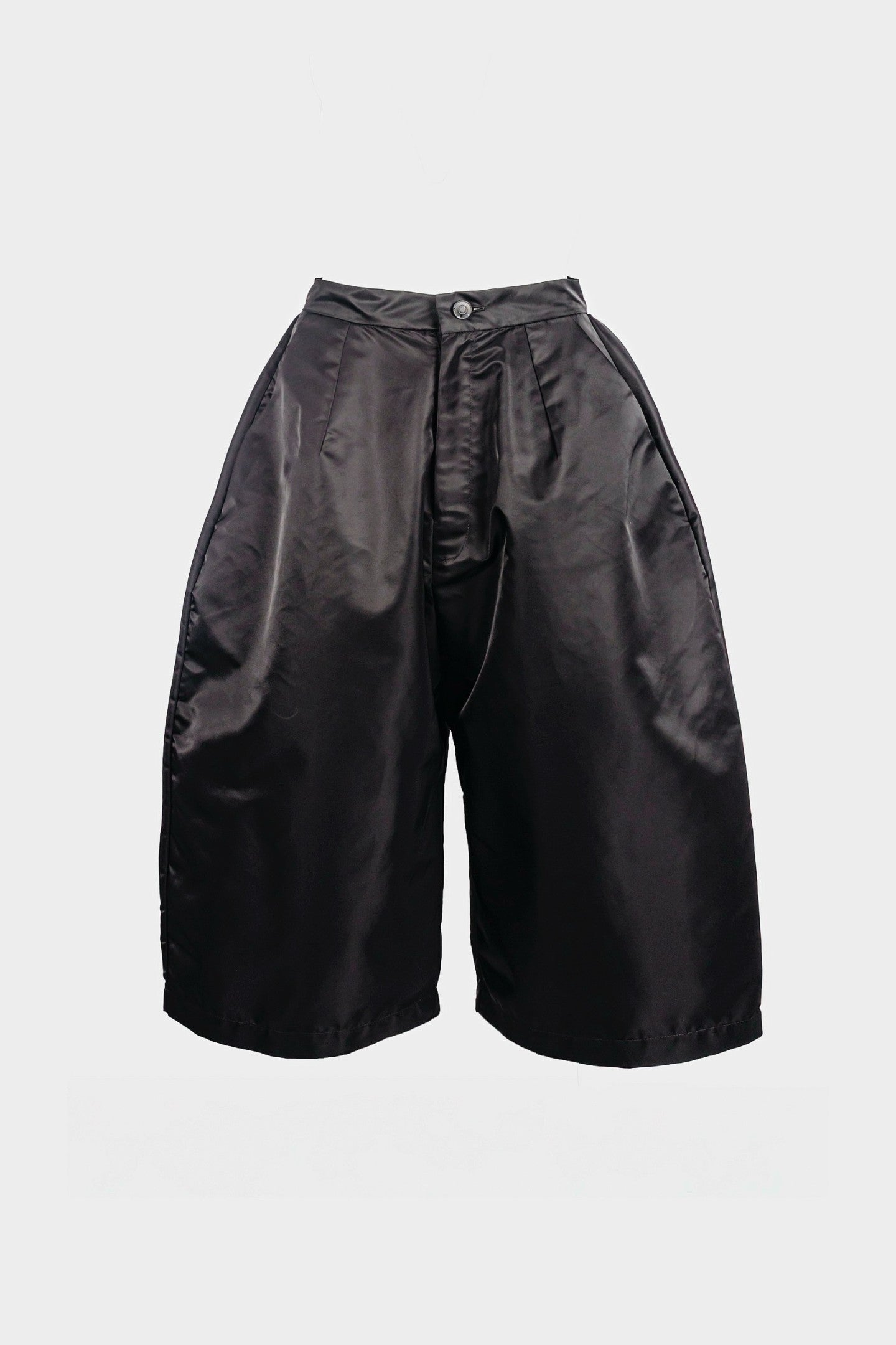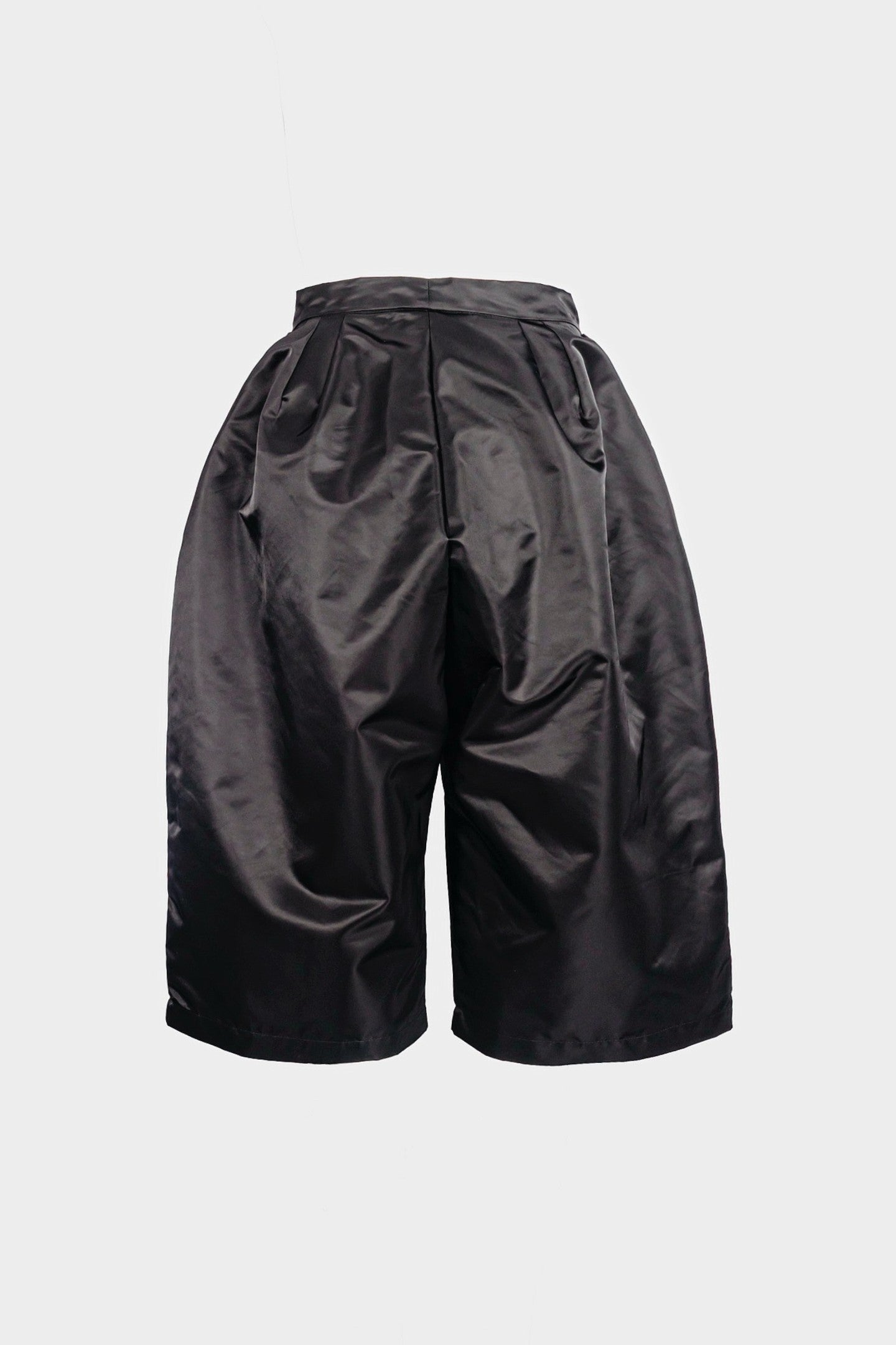 Oval-cut high-waisted nylon pants falling just below the knee, with a roomy silhouette. Featuring discreet side pockets and wide hems for a clean, refined look.